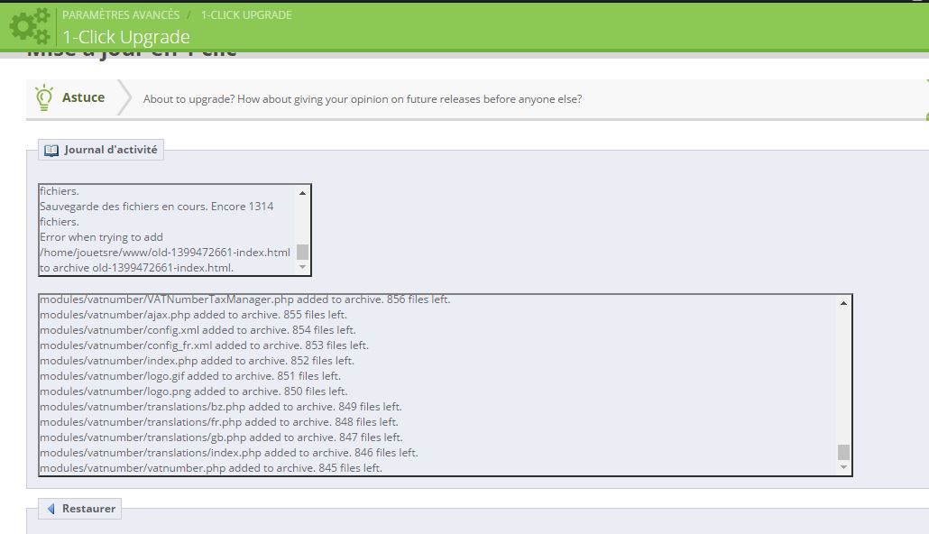 mickael29 Posted August 10, 2016 Share Posted August 10, 2016 Bonjour à tous, Cela fait 2 ans que j'ai ouvert ma boutique en ligne et il y a quelques mois je me suis décidé à faire une mise à jour vers la dernière stable disponible. Donc de 1.6.0.6 vers 1.6.1 Option de sauvegarde tout est coché sur "oui" Option de mise a jour tout est coché sur "oui" Puis je démarre la mise à jour et là ca bloque avec le message d'erreur suivant : voir image en pièce jointe. Quelqu'un saurait-il d'où cela peut venir et comment régler ca. Merci à Tous Link to comment Share on other sites More sharing options...