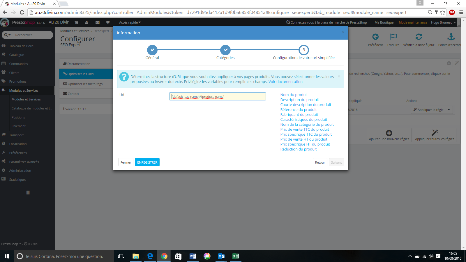 Hugo.b Posted August 10, 2016 Share Posted August 10, 2016 (edited) Bonjour à tous J’ai un problème sur les Url, j’aimerais que l’URL du produit soit du type catégorie/nom du produit. Par exemple pour un produit l’url est http://au20divin.com/94-vin-rouge-bib-10-l-coteaux-de-peyriac-rouge-igp-12.html cependant moi je voudrais http://au20divin.com/28-vin-rouge/ bib-10-l-coteaux-de-peyriac-rouge-igp-12.html Ceci est bien configurer dans mon module SEO cependant cela ne passe pas, voyer vous le problème, je mets un screen de la construction des URLs. Merci pour votre aide Edited August 11, 2016 by Hugo.b (see edit history) Link to comment Share on other sites More sharing options...