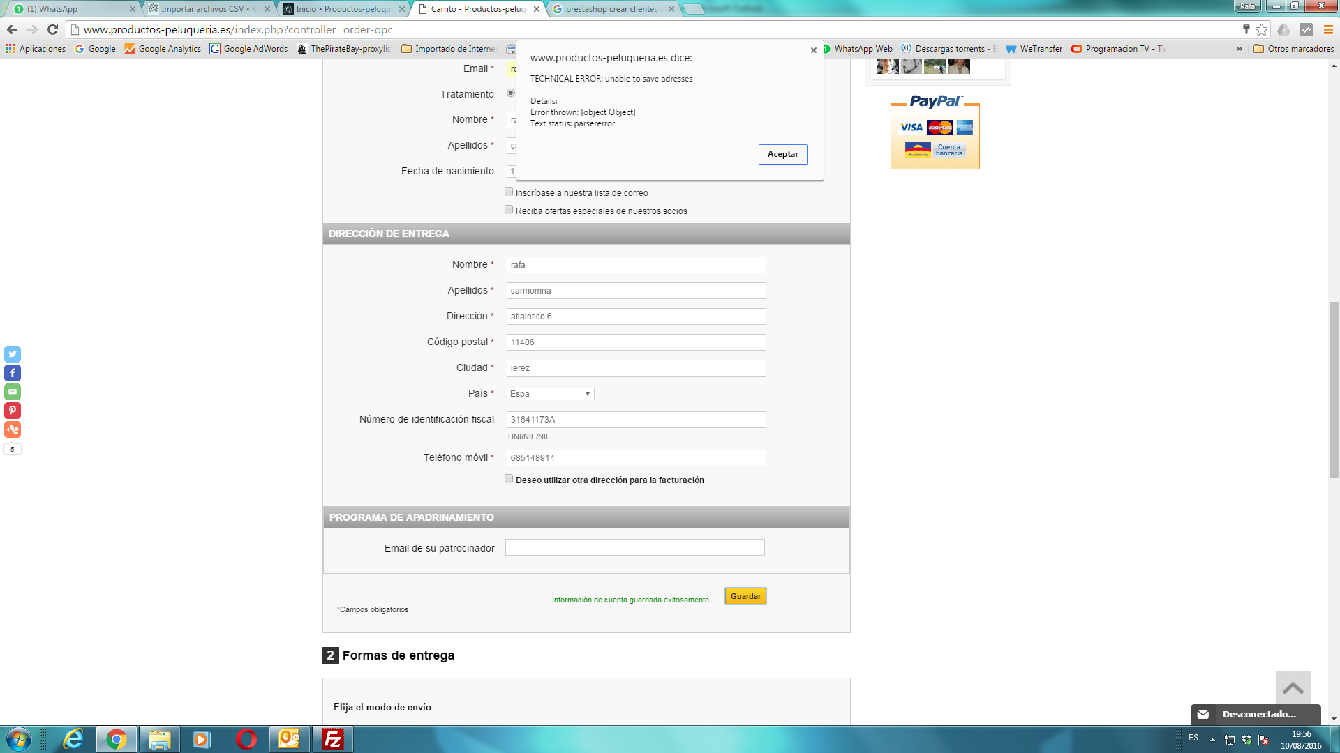 tudeporteysalud Posted August 11, 2016 Share Posted August 11, 2016 (edited) buenos dias ...... Me Dirijo un VDS a ver si alguien le ha Pasado Lo Mismo Y Me PUEDE echar una mano, El caso es que Si hago las Naciones Unidas y al pedido Entrar en la opcion de Crear ONU Cliente instantaneo Aparece un error indicando que no puede guardar las direcciones vease la imagen Que adjunto .... verifico los Datos y en teoria estan en la BASE DE DATOS ... A ver si alguien me puede echar una mano, Gracias Edited August 12, 2016 by tudeporteysalud (see edit history) Link to comment Share on other sites More sharing options...