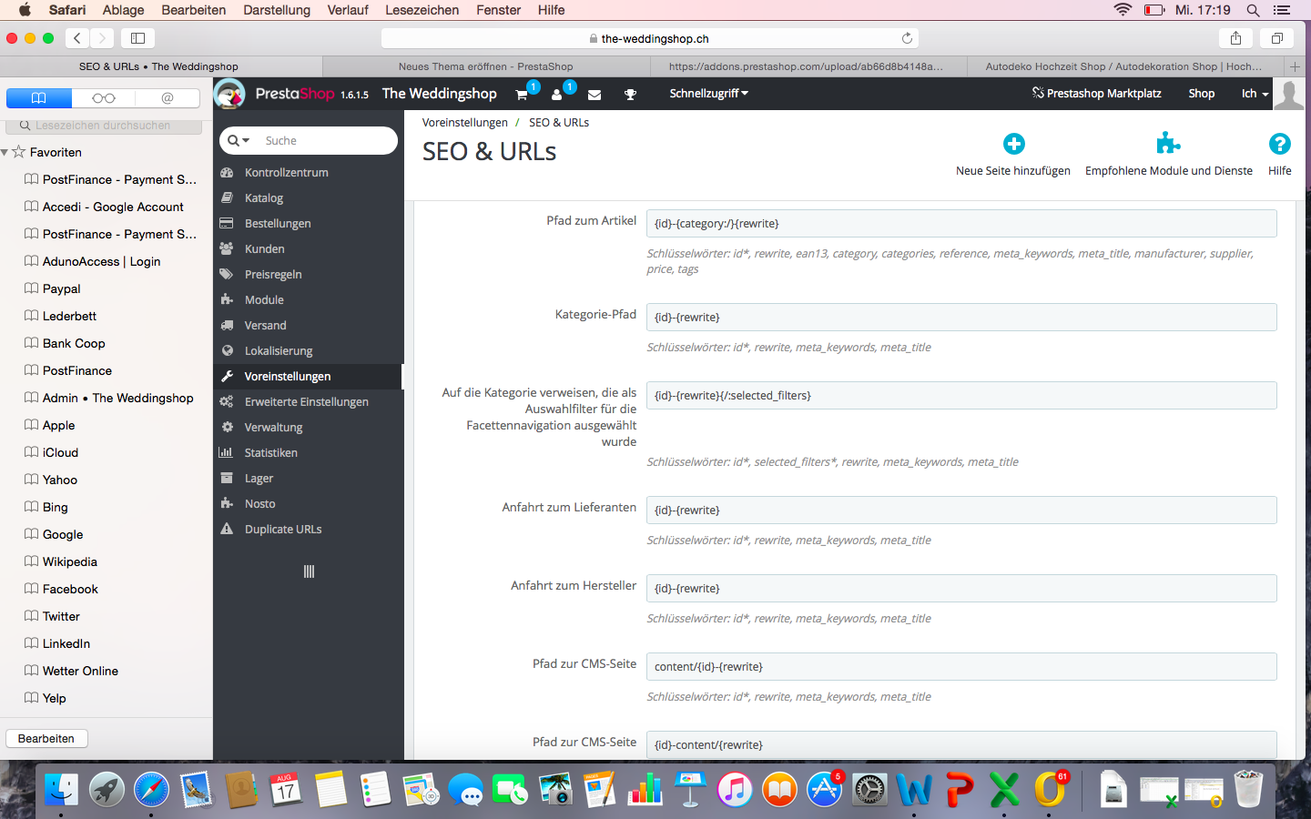 Jo79 Posted August 17, 2016 Share Posted August 17, 2016 Hallo zusammen Ich benutze das Prestashop 1.6.1.5 und seit über einem Jahr habe ich das Modul Pretty Urls installiert. Hat bis vor einigen Tagen super funktioniert, die URL's waren gut ohne id. Vor kurzem waren sie z.b. www.the-weddingshop.ch/de/autodeko zu finden, doch seit ein paar Tagen weiss ich nicht was genau passiert ist und die Urls haben sich verändert, jetzt haben sie plötzlich eine ID drin...also www.the-weddingshop.ch/de/12-autodeko. Die Einstellungen habe ich nicht verändert. Kann mir jemand helfen und sagen was ich anpassen muss, damit die Nummer-Id wieder entfernt wird? Habe auch noch im Anhang einen Printscreen welche Codierungen ich in den Einstellungen habe. Besten Dank schon im Voraus für eure Hilfe. lg Jo79 Link to comment Share on other sites More sharing options...