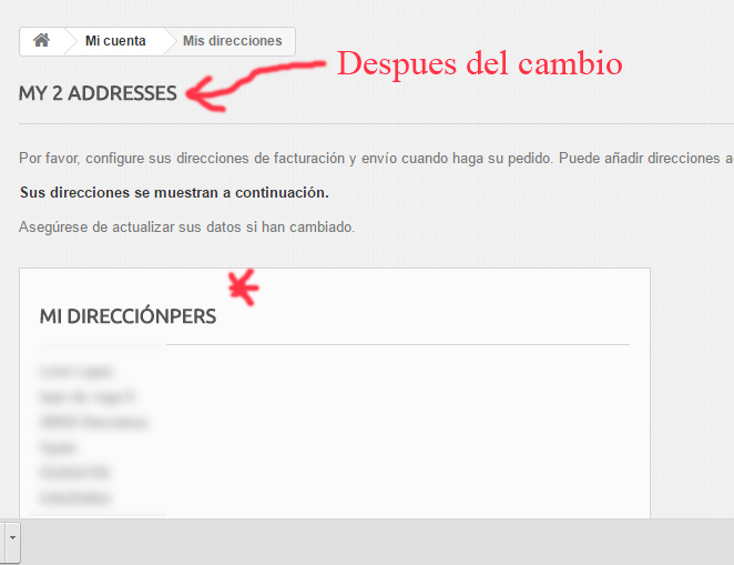 crnjohnsen Posted August 22, 2016 Author Share Posted August 22, 2016 hola jgamio estoy usando la platilla (default-bootstrap) en el archivo addresses.tlp esta la linea que me decis <h1 class="page-heading">{l s='My addresses'}</h1> saludos Link to comment Share on other sites More sharing options...