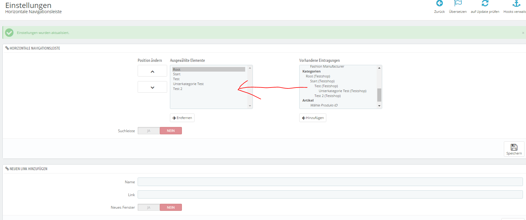 Olikun Posted August 21, 2016 Author Share Posted August 21, 2016 (edited) Hallo Whiley, wow bist du schnell Danke für den Tipp. Die "Horizontale Navigationsleiste" war aktiv, aber die Kategorien waren nicht auf der Linken seite eingetragen (siehe Biild) Habe alle rüber geschoben und es hat geklappt. Mich wundert aber das dies so ist. Ich habe da garnichts dran geändert. Habe nur die vorhandenen Kategorien gelöscht um neue anzulegen, welche dann eben nicht angezeigt wurden Viele Grüße Nina Edited August 21, 2016 by Olikun (see edit history) Link to comment Share on other sites More sharing options...