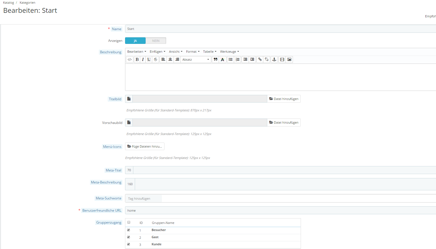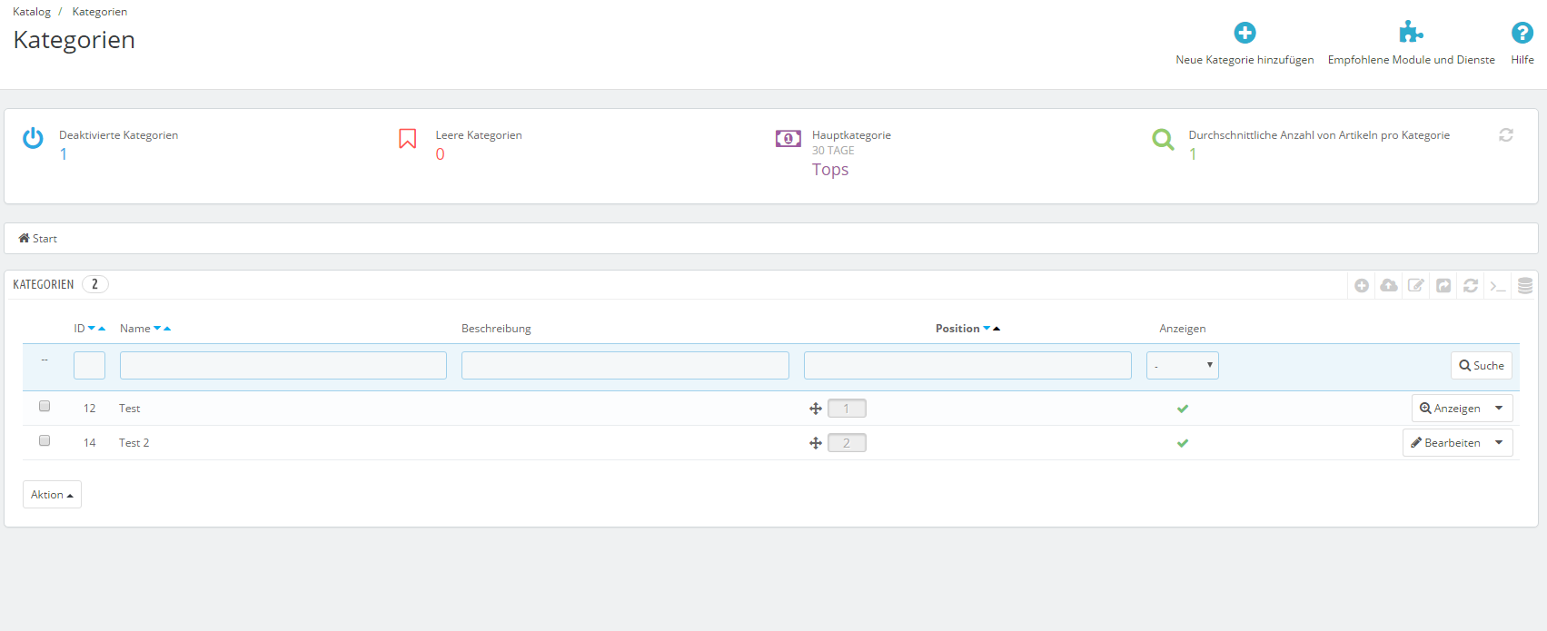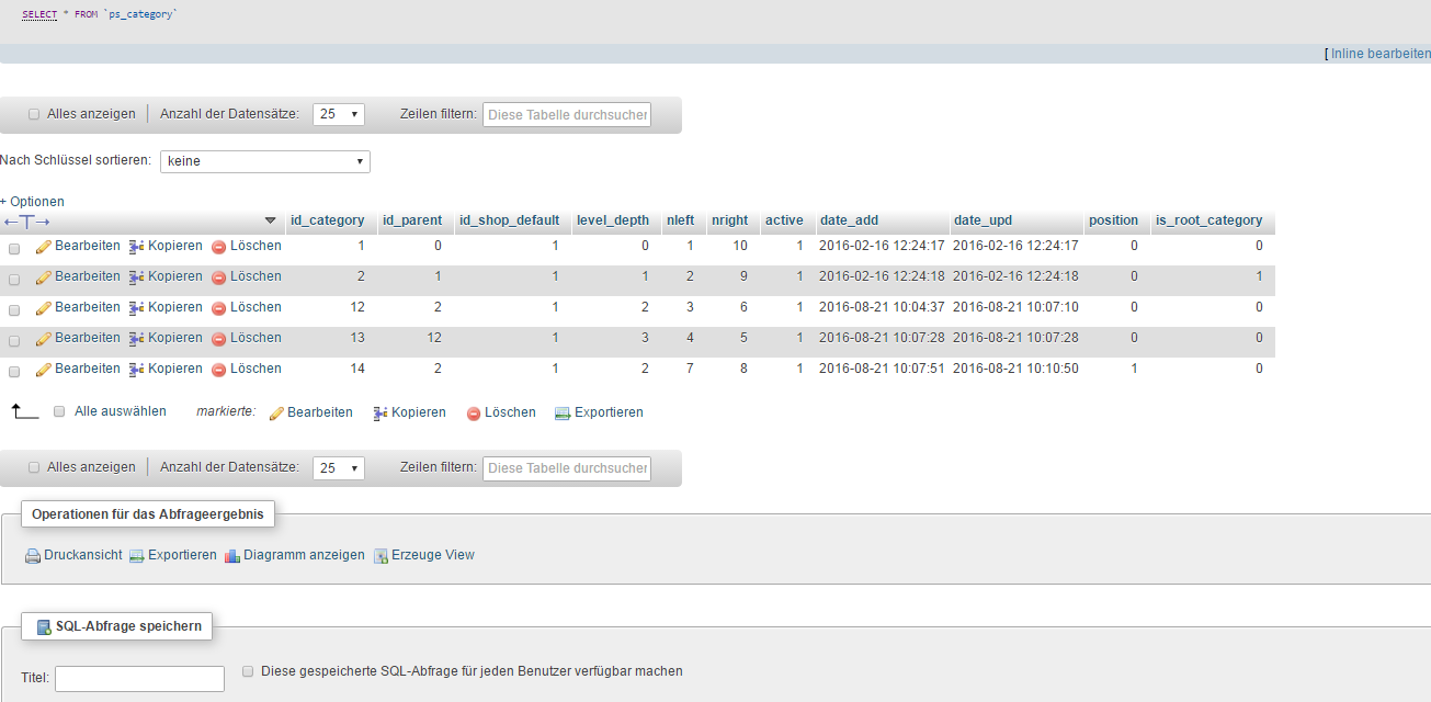 Olikun Posted August 21, 2016 Share Posted August 21, 2016 Hallo, ich probiere gerade etwas mit Prestashop rum und habe ein kleines Problem. Ich habe drei Kategorien die wie folgt lauten Test => Unterkategorie Test Test 2 Alle Kategorien sind aktiv, werden aber nicht im Frontend angezeigt (siehe Bild 4) Dort wo der Rote Kreis ist, sind sonst immer die Kategorien gewesen. Im Backend in der Kategorie-Übersicht steht auch bei "Deaktivierte Kategorien" eine "1" Es sind aber alle Kategorien aktiv oder ist damit die Start Kategorie gemeint? Die ist aber meiner Meinung nach auch aktiv (siehe Bild 2) Habe auch mal ein Screenshot vom phpMyAdmin von der Tabelle "ps_category" gemacht, dort werden doch Kategorien aufgeführt oder ist das eine der anderen Tabellen? Mich wundert auch das in der "ps_category" Tabelle ganze 5 Einträge sind, obwol ich nur 3 Kategorien habe (4 wenn man die Start Kategorie dazu zählt) Hoffe mir kann jemand helfen Viele Grüße Nina Link to comment Share on other sites More sharing options...