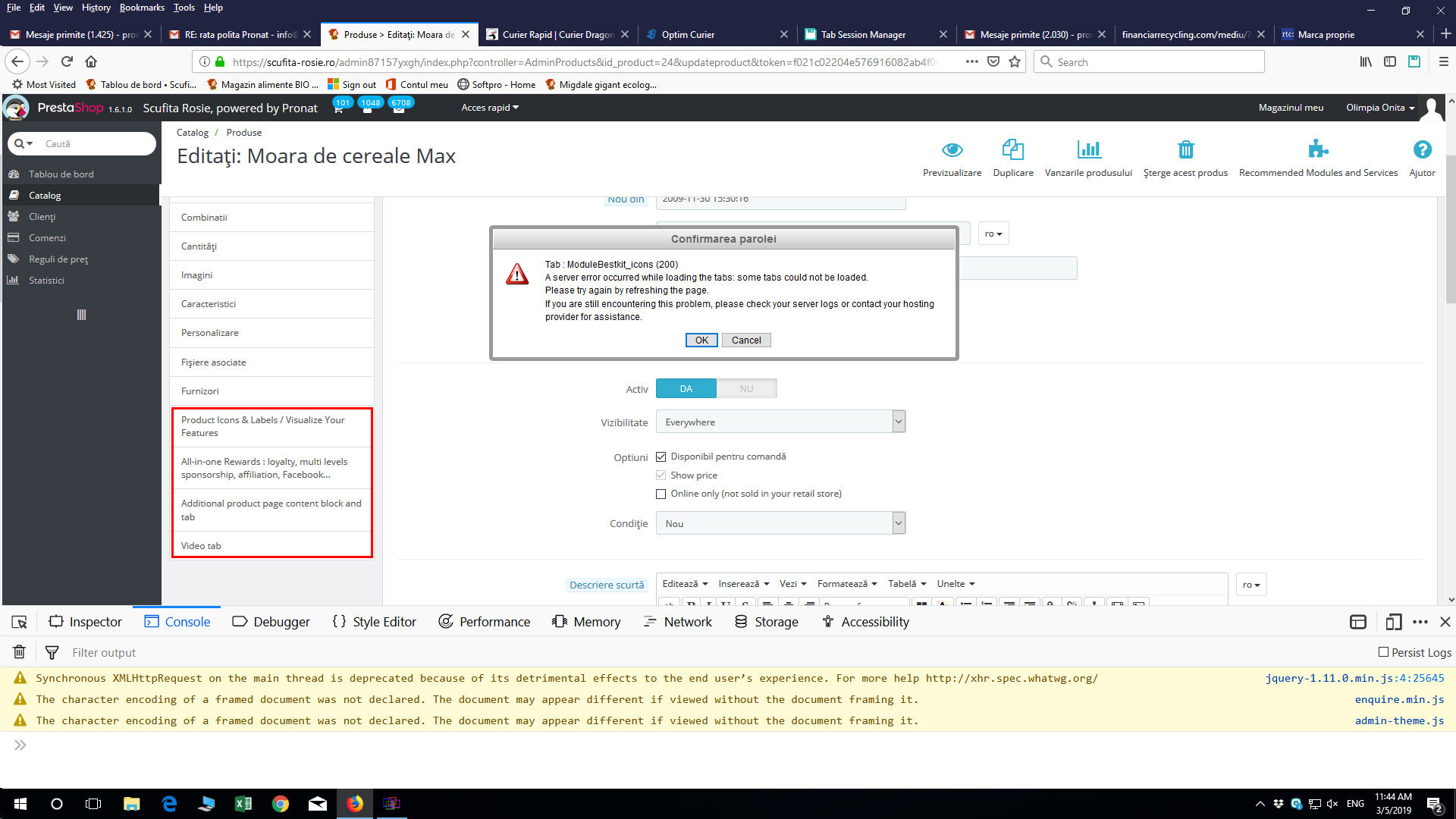 Vali Iacobescu Posted March 5, 2019 Author Share Posted March 5, 2019 (edited) Hi Vekia, For 2 years I had no problem with this error. But since a few days ago, the error reappeared. For some computers of our employees the error don't happens, including my computer. Very strange, indeed. Again, the hosting company says that is it a browser java problem, lack of RAM memory, etc. The hosting company had a network crash and my site was not working for two days because of that. Their mySql server crached and they had to move all to another mySql server. I attached a browser log console image. Please take a look. Also, I have to mention that popup message appear only for the 4 tabs marked with red color which come with the bought theme and payed modules. If I leave only the default product tabs activated, everything it's ok. I deactivated the 4 modules and everything it's ok, but I need them to be functional. A have to mention that I did not update anything, neither the modules involved nor the theme, prestashop, etc. Edited March 5, 2019 by Vali Iacobescu (see edit history) Link to comment Share on other sites More sharing options...