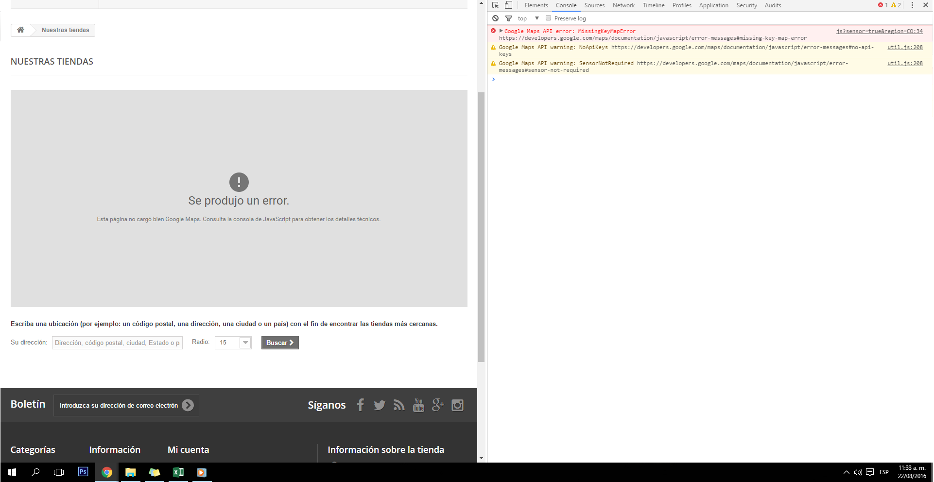 David_10 Posted August 22, 2016 Share Posted August 22, 2016 Buen Día. Tengo mi tienda en Prestashop 1.6, agregué las tiendas con la ubicación geográfica (longitud y latitud) pero al intentar visualizarlas me da el siguiente error: Estuve revisando en la consola Javascript pero no encuentro dónde modificar la Key de la API de Google, ya la generé, esos son los errores que me resultan. Agradezco su ayuda. Feliz Día. Link to comment Share on other sites More sharing options...