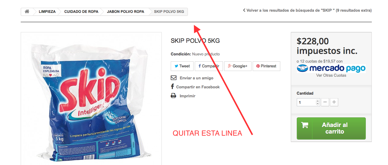 enio19 Posted August 25, 2016 Author Share Posted August 25, 2016 BUSCANDO BUSCANDO LO ENCONTRE!! Hay que modificar la linea del product.css dentro de la carpeta de ./default-bootstrap/css .top-hr { background: #C4C4C4; height: 5px; margin: 2px 0 31px; } por: .top-hr {display:none} Saludos 1 Link to comment Share on other sites More sharing options...