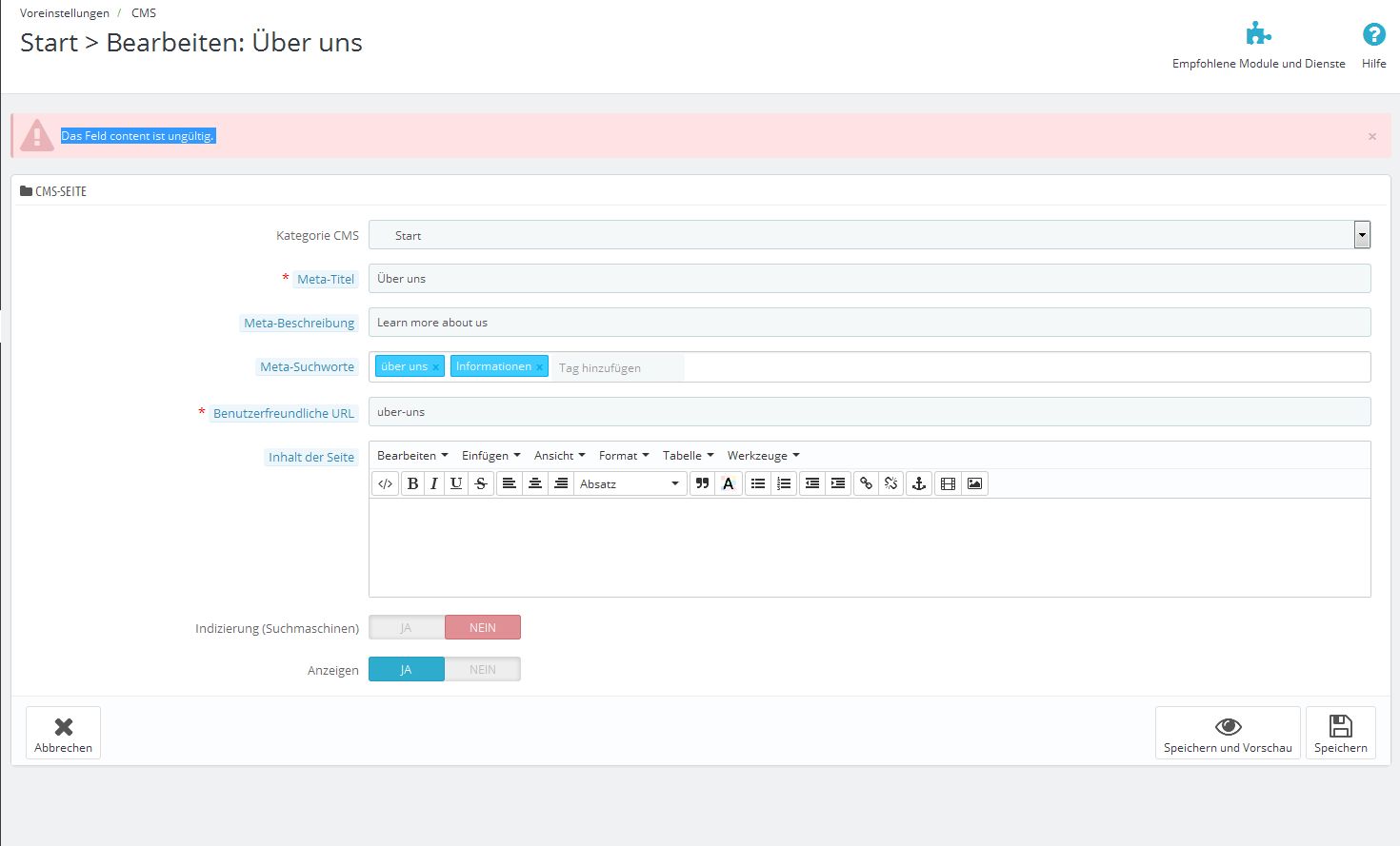 radioschwinn Posted August 24, 2016 Share Posted August 24, 2016 Good Morning dear Presta Community! I have the following problem: If I want to add some text at "content of the site" of my CMS site, I receive the message "The field content is invalid". I google since two days and I dont know what I should do.. Link to comment Share on other sites More sharing options...