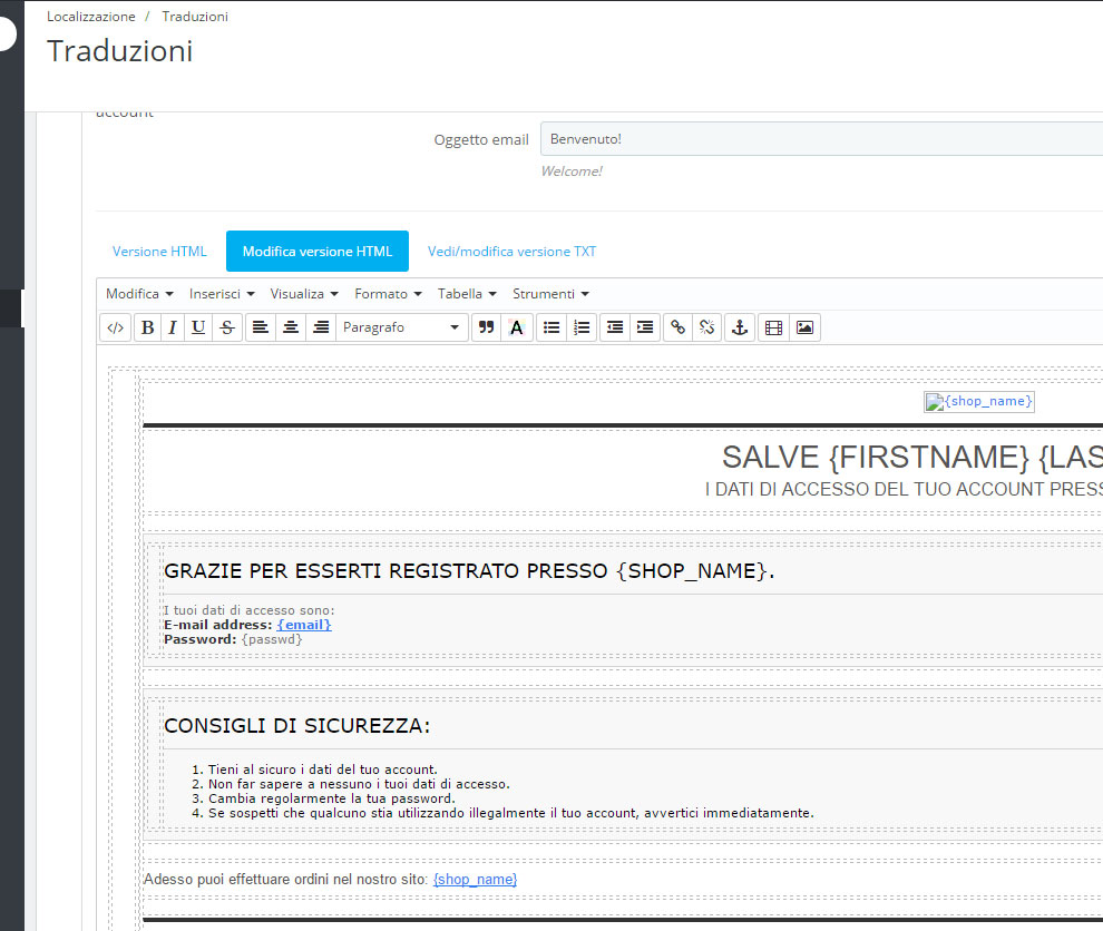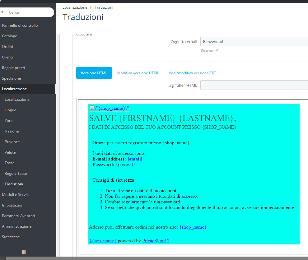 duemilioni Posted August 24, 2016 Share Posted August 24, 2016 Ciao uso la versione 1.6.1.6 sto traducendo le mail accedendo da BO Localizzazione>Traduzioni>Traduzioni modelli email Scelgo il NUCLEO piuttosto che un tema e la lingua ITALIANO Prima voce: CORE EMAIL > Italiano la versione HTML che vedo è come da foto che allego... un fondo cyano e testo in Times new roman se clicco su Modifica Versione HTML invece è tutto ok (verificato anche facendo copia del sorgente come sistemo ? da cosa potrebbe dipendere ? Grazie Link to comment Share on other sites More sharing options...