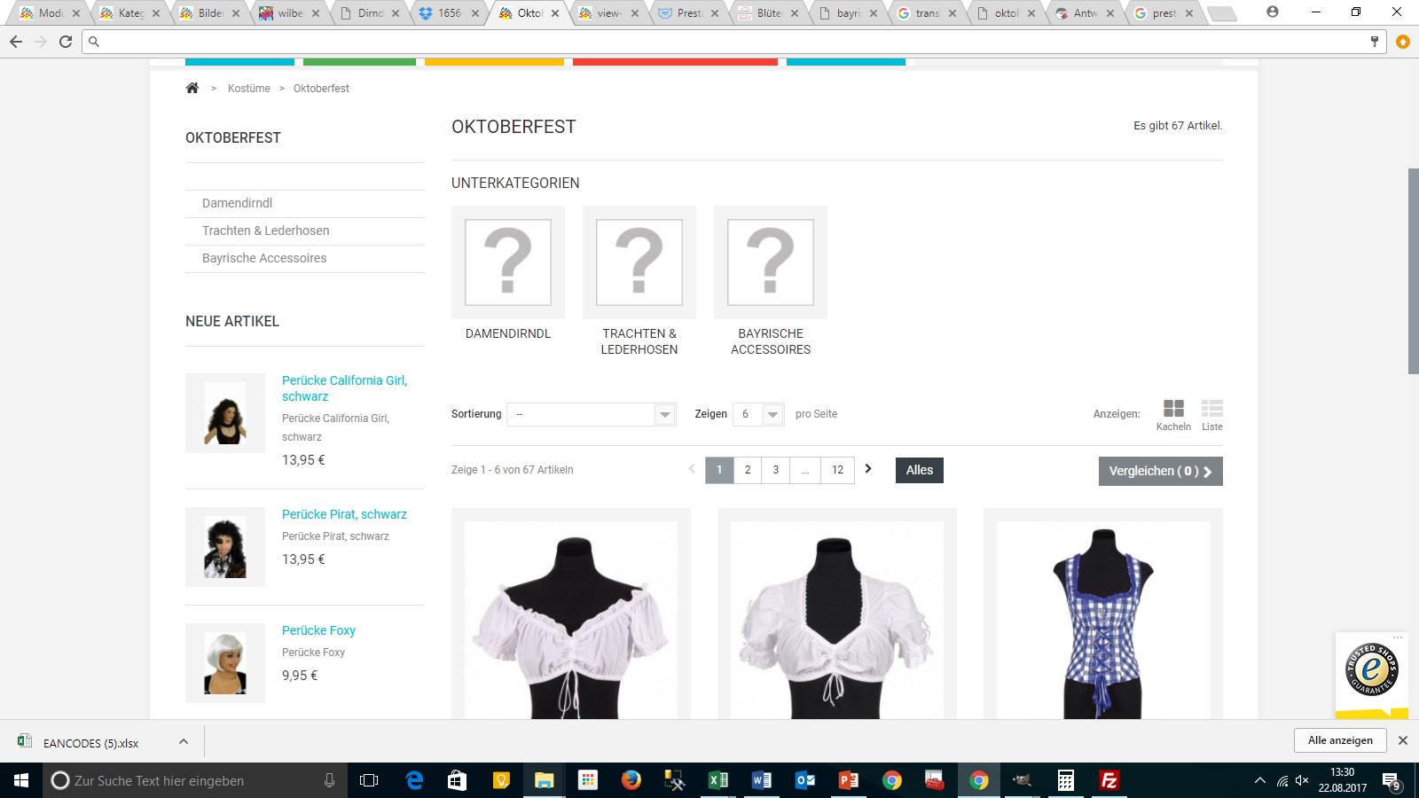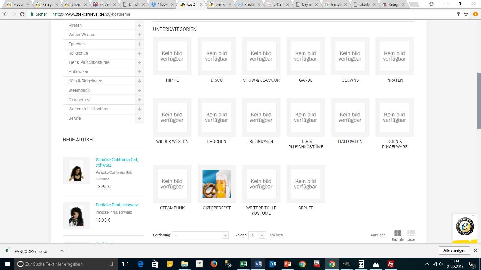 DieserEppi Posted August 22, 2017 Share Posted August 22, 2017 (edited) Hallo Community, Haut mich ruhig aber ich finde immer nur die gleichen 2 Threads die mir leider nicht weiterhelfen. Auch ich habe das nette Problem mit den Bildern der Unterkategorien. Um mein Problem zu erläutern benutzte ich die Kategorien Start->Kostüme->Oktoberfest->Damendirndl /Trachen & Lederhosen /Bayrische Accessoires. "Start->Kostüme" wird in der Nav.Leiste oben angezeigt und bracht demzufolge kein Bild. Unter "Kostüme" ist unter anderem auch die Kategorie "Oktoberfest", welche ich ganz nochmal mit einem Vorschaubild versehen (Bild 1) habe und dieses auch entsprechend angezeigt wird (Bild 2). Das große Kategoriebild, worin auch der Text eingebettet sein soll lasse ich dort erstmal außen vor. Jetzt möchte ich das gleiche für die Unterkategorien von "Oktoberfest" machen. Habe also wieder ein Bild inder entsprechenden Größe vorbereitet und es in der Kategorie "Bayrische Accessoires" eingefügt (Bild 3). Nun sind unter "Oktoberfest" alle Unterkategorien nur mit einem Fragezeichen versehen (nicht mehr wie vorher mit "Kein Bild verfügbar")(Bild 4). Ich hab mich natürlich beriets durchs Internet geklickt und verscheidene Lösungsansätze probiert. Die Bilder sind im richtigen Größen- und Dateiformat. Habe in meinem Jugendlichen Übermut ein wenig bei den Bildformaten verstellt, in der Hoffnung etwas zu erreichen, leider vergeblich. Will nicht beschwören dass ich es nicht selbst dadurch vergeigt habe. So sehen momentan die Bildformate bei mir aus. (Bild 5) Ich werd auch nicht ganz schlau draus, wann der wo welches Bild benutzt und wie ich das herausfinden kann. Beginne langsam zu vertzwifeln und wäre über jede Hilfe dankebar. Hochachtungsvoll Dieser Eppi Edited August 22, 2017 by DieserEppi (see edit history) Link to comment Share on other sites More sharing options...