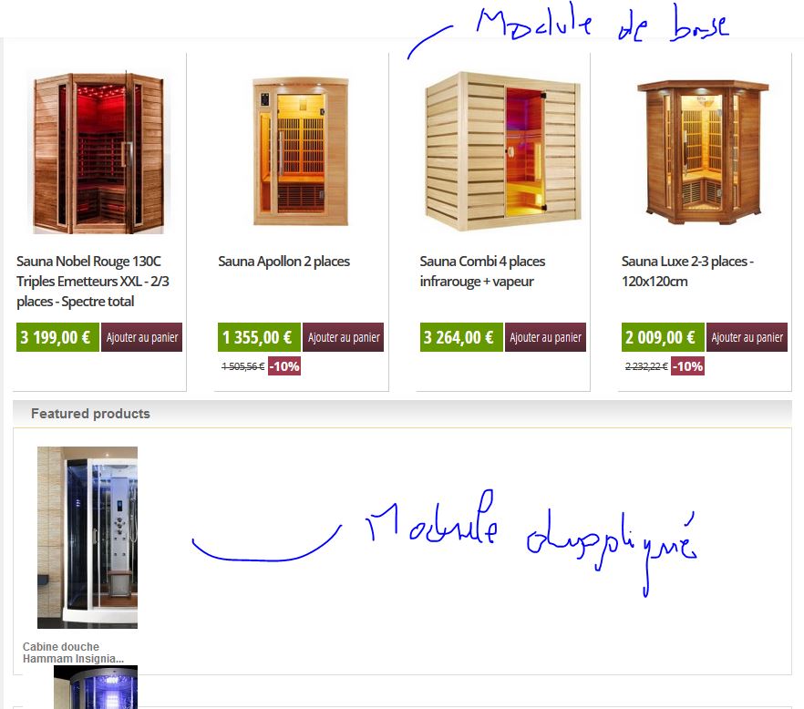cyril12 Posted August 29, 2016 Share Posted August 29, 2016 Bonjour, J'ai dupliqué le module Homefeatured en Homefeaturedxx1 J'ai procédé aux modifications necessaires pour que ce module soit vu comme deuxième module. Mais petits pb.... Le module d'origine Homefeatured affiche image produit, nom produit, prix barré (old price), % reduc, prix et lien panier alors que mon module Homefeaturedxx1 remonte image produit, nom produit, prix, lien vers produit :-/ En inspectant le code source je constate : <div class="tab-content"><div class="box-home premier"><ul id="homefeatured" class="product_list grid row homefeatured tab-pane active"> ---- > contenu module Homefeatured<div id="featured-products_block_center" class="block products_block clearfix"> --- > contenu module Homefeaturedxx1</div> dans un cas <ul> dans l'autre une <div> (qui correspond au template du module)... je ne comprends pas pourquoi Link to comment Share on other sites More sharing options...