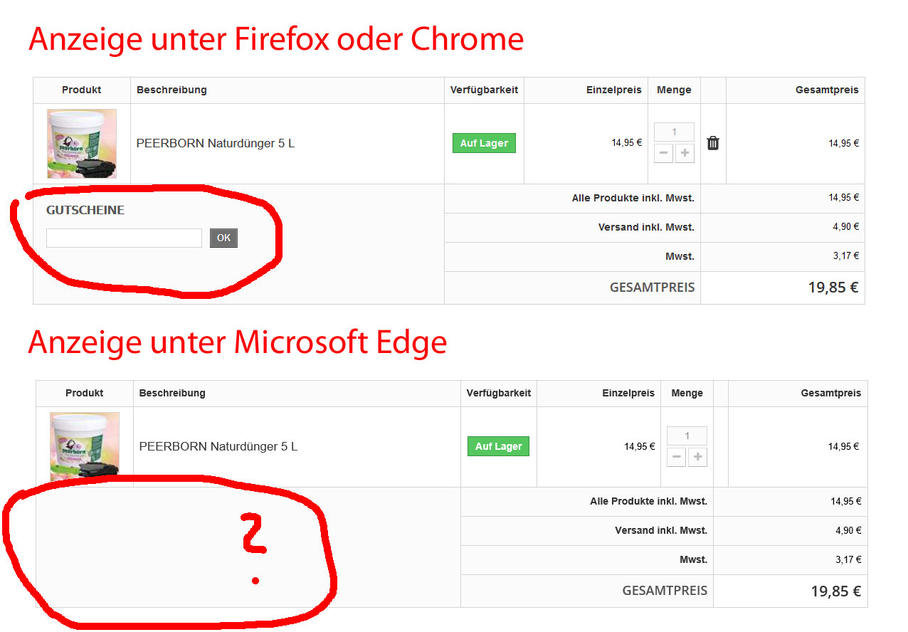 mechelmedia Posted August 29, 2016 Share Posted August 29, 2016 Hallo zusammen, ich habe eine Warenkorb-Preisregel erstellt, die den Kunden erlaubt, einen Gutscheincode im Warenkorb einzugeben. Funktioniert in den Browsern Firefox oder Chrome einwandfrei – nur im neuen Microsoft Edge wird der gesamte Gutschein Code-Eingabebereich im Warenkorb überhaupt nicht dargestellt. Das ist natürlich oberärgerlich für alle Kunden, die Edge benutzen, weil sie dann nicht die Möglichkeit haben, ihren Gutscheincode einzulösen. Weiß jemand, woran das liegt bzw. wie man das behebt?Ist das eine Sache seitens Edge oder muss ich an irgendeiner Stelle den Code in einem Template entsprechend anpassen? Ich benutze ein Standard-Template für den Shop. GrüßeThomas Link to comment Share on other sites More sharing options...
