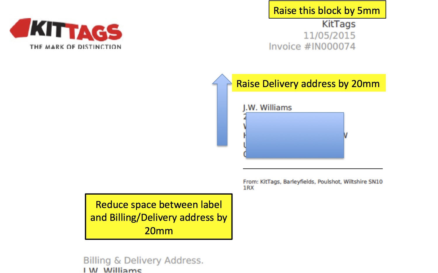 GMM148 Posted August 30, 2016 Share Posted August 30, 2016 Hi, can anyone advise on settings changes please? I'm using Integrated Labels single label invoice sheet and I need to change where the address prints on the label. I've attached an image showing what I want to achieve. 1. Invoice Number top right - this just prints onto the label, so want to raise by 5mm 2. Delivery addresss - want to raise this by 20mm so it prints on the label, at moment it's not 3. Space - want to decrease the space between the bottom of the label and the Billing/Delivery address block Lastly, if you can give me code on how to put the logo on the delivery label that would be much appreciated. Thanks in advance. KitTags Link to comment Share on other sites More sharing options...