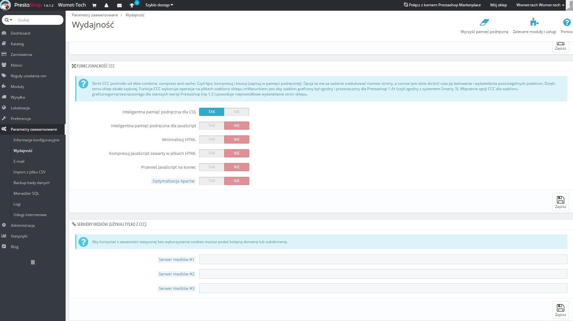 maniera Posted August 31, 2016 Share Posted August 31, 2016 Witam, Jeszcze w budowie ale już kończymy i chcielibyśmy ją uruchomić. |Chodzi o womet-tech.pl/v2Jeżeli chodzi o FTP : Folder compile i cache w smartach katalogu głównego wyczyszczone. Jeżeli chodzi o ustawienia wydajności w PA to jak na screnach. Strona ma trochę podkategorii / 400 produktów i 600 klientów - produkty i klienci przeniesieni z presty 1.4.4 Nie wiem co zrobić już próbowałem wszystkiego o czym wiem ... strona leży na hekko. Dzięki. ! Link to comment Share on other sites More sharing options...