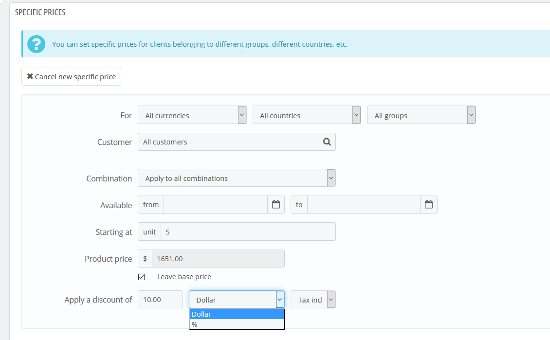 It is possible to add several specific prices for one product, set limitation per customer, country, product combination, etc.