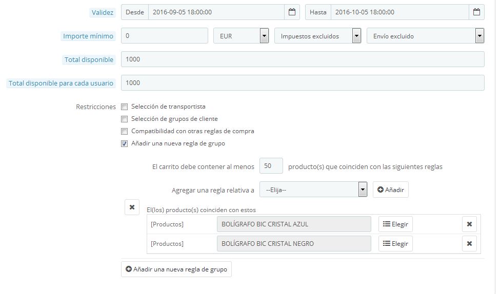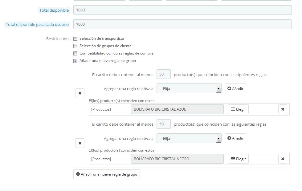 savan Posted September 6, 2016 Share Posted September 6, 2016 Buenas tardes a todos No se si lo que voy a preguntar se puede hacer o no. El caso es que quiero aplicar un cupón de descuento a varios artículos de mi tienda, y no se que estoy haciendo mal. Tengo varios artículos a los que voy a aplicarles distintos procentajes de descuento, y los divido en grupos (mentalmente) segun estos descuentos. Voy a reglas de precios - reglas de compra, genero una nueva regla de precio, le doy un nombre y no genero codigo porque quiero que se aplique automáticamente. Marco resaltar SI para que el cliente vea la regla aplicada, uso parcial NO y activado SI. Paso a la pestaña condicion, donde no indico ningun cliente, selecciono fecha de inicio y final del cupón, importe minimo del carrito (0) y en total de cupones disponibles indico 1000 y 1000 para cada usuario. En restricciones, si por ejemplo quiero indicar un 15% para una serie de productos, marco añadir regla de grupo, y voy añadiendo los productos y las cantidades minimas de cada uno. Y aqui viene el problema... (adjutno imagenes) Si por ejemplo quiero aplicar la regla al boligrafo azul y tambien al negro, añado dos reglas de grupo, una que indica que al menos debe contener 50 boligrafos azules y otra que indica que debe contener al menos 50 negros. En la pestaña acciones le indico el porcentaje de descuento y marco "para productos seleccionados". El problema es que si el carrito no contiene 50 boligrafos azules "Y" 50 negros, no me aplica el descuento. Lo que quiero es que si hay 50 azules, se aplique el descuento a los azules, y si hay 28 negros, no le aplique estos. Es decir que no se deban cumplir todas las condiciones de todos los articulos para que alguno tenga ese descuento. Decir que he probado tambien a añadir ambos productos en una misma regla de grupo y tampoco funciona. Solo he conseguido que aplique el descuento si genero una regla para cada artículo (una para el boli azul, otra para el negro, otra para el rojo...) Y claro si quiero poner 50 articulos en promocion con un mismo descuento, otros 30 con otro descuento, otros 25 con otro.... tengo que generar 105 reglas distintas. ¿Estoy haciendo algo mal? La version de Prestashop es la 1.6.1.6 y estoy en local por ahora. Un saludo y gracias Link to comment Share on other sites More sharing options...