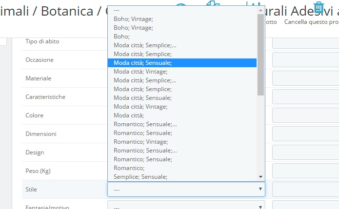 vucumbra Posted September 8, 2016 Share Posted September 8, 2016 Sto cercando di capire come inserire più varianti per una caratteristica. Mi spiego meglio: Se un mio prodotto ha come caratteristica Stile e ha come valore(variante) Casual e Elegante, vedo che non cè modo di inserire 2 varianti per la stessa caratteristica Posso solo inserire un valore!?( vabbè cè anche il personalizzato, ma non è quello che mi serve) Questa cosa è limitativa o sbaglio? Se lo metto manualmente non cè modo di inserirle più di una Se lo metto con i csv ho provato a fare: stile:Casual,Elegante:0 e mi registra come caratteristica l'intera stringa e non i valori separati di conseguenza quando faccio la ricerca a strati mi esce di cercare tutti i prodotti che hanno come valore "Casual,Elegante" cioè l'intera stringa e quindi un solo prodotto... Non so se mi sono spiegato bene, qualcuno sa come risolvere? anche se mi sembra irrisolvibile Grazie ciao Link to comment Share on other sites More sharing options...