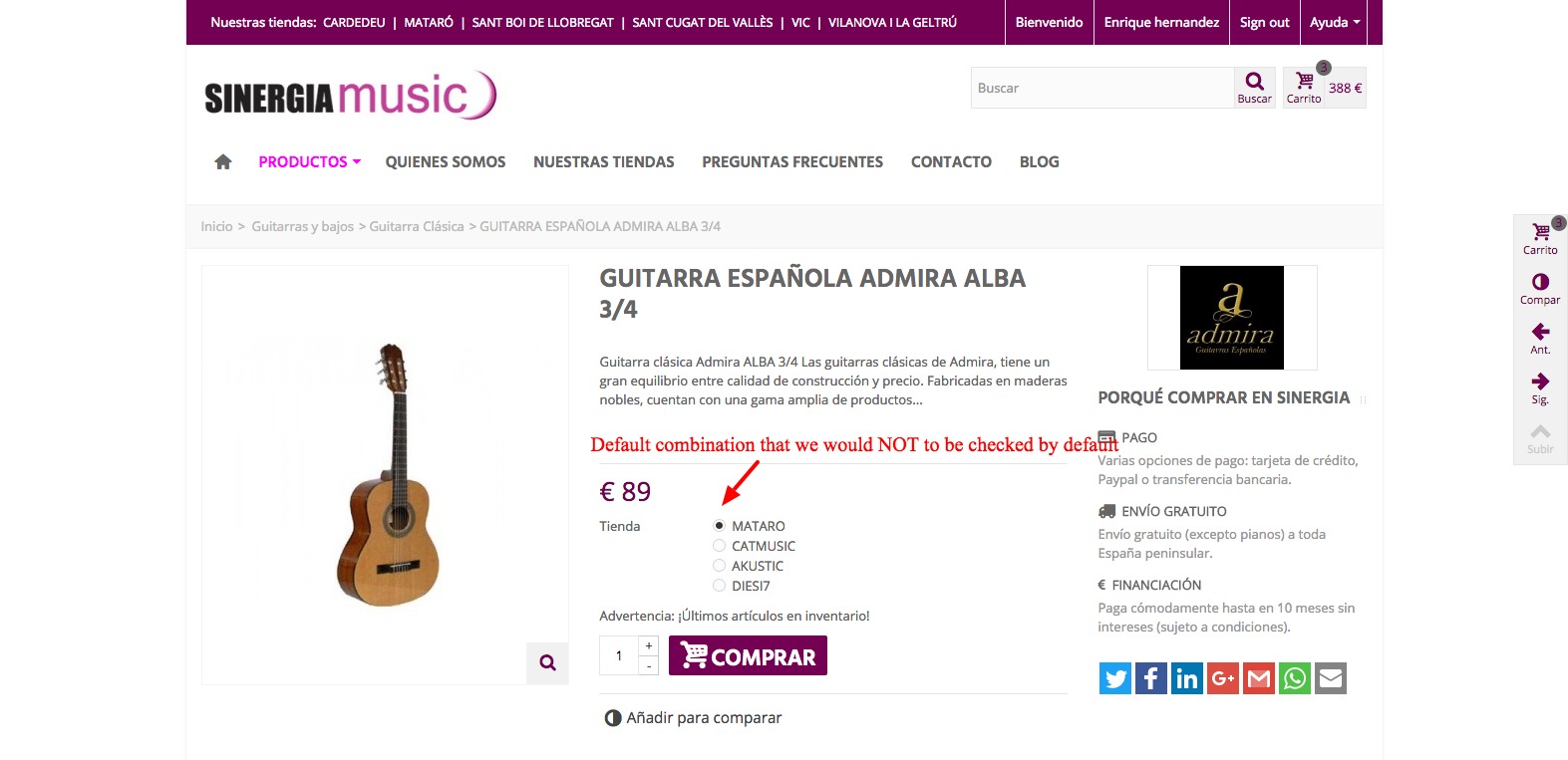 nicnacweb Posted September 8, 2016 Share Posted September 8, 2016 (edited) Hello I wonder if somebody can help me, we have a musical instruments store in wicc the products have some attributes that correspond with our brick and mortar stores The problem is that in the product page, the default combination is checked and we would like not to be (as this is a little bit difficult to explain please see the attached image). Is no problem that there is a default combination, we don0t want to show checked in the frontend. Any help would be greatly appreciated http://sinergiamusic.es/ Edited September 8, 2016 by nicnacweb (see edit history) Link to comment Share on other sites More sharing options...