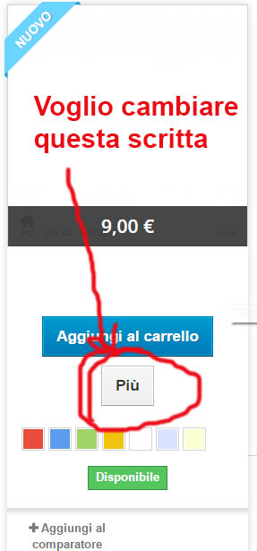 slorenx Posted September 14, 2016 Share Posted September 14, 2016 Qualcuno sa dirmi come faccio a cambiare la scritta " Più" del pulsante per vedere i dettagli del prodotto? Ho provato tramite il pannello di amministratore alla sezione traduzioni e provato a cercare nelle traduzioni del front office, del back office e dei moduli installati ma non sono riuscito a trovare la parola da cambiare. Cioè, ho trovato alcune parole " Più" e le ho cambiate ma non ha avuto alcun effetto sulla modifica che voglio. Qualcuno sa dirmi come devo fare? ( allego una foto che mostra quello che devo cambiare) Grazie in anticipo. Link to comment Share on other sites More sharing options...