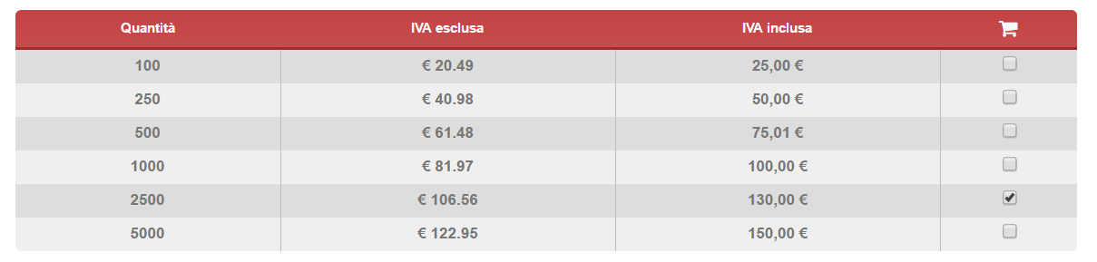 jesper03 Posted September 16, 2016 Share Posted September 16, 2016 Hi everyone, I implemented a simple function in my shop in order to show a table under the product's description to show only some kind of combinations. More precisely, for some product I added the attribute "Quantity" and "Graphic" so what I have is for example: QUANTITY 100 200 500 1000 GRAPHIC YES NO Choosing "Graphic YES" the price is improved by 5€. In my table I want to show only price related to the combinations of "Quantity" and "Graphic NO". I putted this in my ProductController.php $groups[$row['id_attribute_group']]['name_price'][$row['id_attribute']] = array('name' => $row['attribute_name'],'price' => number_format($row['price'],2), 'attribute_id' => $row['id_attribute']); and this in my product.tpl {if $product->id_category_default == 17} <div id="avviso_upload" style="font-weight:bold;">I seguenti prezzi si intendono con realizzazione grafica a carico del cliente.</div> <div id="attributes"> <div class="clearfix"></div> {foreach from=$groups key=id_attribute_group item=group} {if $group.attributes|@count} <fieldset class="attribute_fieldset"> {assign var="groupName" value="group_$id_attribute_group"} <div class="attribute_list"> {if ($group.group_type == 'radio')} <table id="table_quantita"> <tr class="table_head"> <th class="th_quantita">Quantità</th> <th class="th_quantita">IVA esclusa</th> <th class="th_quantita">IVA inclusa</th> <th class="th_quantita"><i class="icon-shopping-cart th_icon"></i></th> </tr> {foreach from=$groups key=id_attribute_group item=group} {if $group.attributes|@count} {foreach from=$group.name_price key=id_attribute item=group_attribute} {if $group.name|strstr:"Quantità"} <tr class="tr_quantita"> <td class="td_quantita">{$group_attribute.name}</td> <td class="td_quantita">{$currencySign|html_entity_decode:2:"UTF-8"} {$group_attribute.price}</td> <td class="td_quantita">{convertPrice price=({$group_attribute.price}*1.22)}</td> <td class="td_quantita"> <input type="radio" class="attribute_radio" name="{$groupName|escape:'html':'UTF-8'}" value="{$id_attribute}" {if ($group.default == $id_attribute)} checked="checked"{/if} /> </td> </tr> {/if} {/foreach} {/if} {/foreach} </table> {/if} </div> </fieldset> {/if} {/foreach} </div> <div id="avviso_upload" style="font-weight:bold; font-size: 16px;">*La grafica fornita dal cliente può essere inviata tramite l'apposito modulo sottostante prima di procedere con l'ordine o in alternativa può essere inviata in seguito con la funzione <a href="http://www.tipografiagrillo.com/index.php?controller=contact3" target="blank"><span style="color: #b22222;">Invia File</span></a> specificando il codice dell'ordine ed eventuali dettagli aggiungitivi.<br> </div> <a href="http://www.tipografiagrillo.com/index.php?controller=contact2" target="blank"><div class="text_preventivo_prodotti"><h2 class="text_preventivo_h2"> Per quantità e formati personalizzati richiedi un preventivo</h2></div></a> {/if} I created all the combination using the Combination Generator. The problem is that for some rows of the table I have the price related to "Graphic YES" that is not what I want. In the attached file you can see my table, the 5° row is wrong, because the price 130€ is related to the combination of Quantity 2500 and graphic Yes while all the other prices are related to the combination of Quantity and Graphic No. I hope that the problem is clear and that someone can help me. Thanks in advance. Link to comment Share on other sites More sharing options...