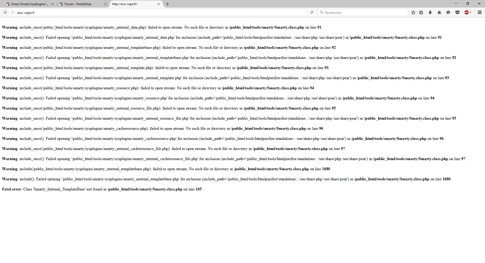 Eco-Vape.fr Posted September 19, 2016 Share Posted September 19, 2016 Bonjour,Suite à une mauvaise manipulation j'ai supprimer des fichiers dans le dossier: smarty (/cache/smarty) du coup j'ai plus aucun accès a mon site.Pouvais vous m'aider à rétablir mon accès svp. Merci pour votre aide. Link to comment Share on other sites More sharing options...