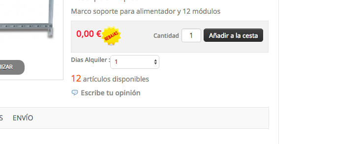 txuacode Posted September 22, 2016 Author Share Posted September 22, 2016 De manera gratuita lo podrías lograr con los atributos y valores, en atributos pones el alquiler y en valores el de un dia, dos, dias, una semana, etc. y lo que deseas poner la fecha de entrega, y fecha de devolución es más difícil y si tendrás que acudir a un o de pago o un desarrollo a medida. Gracias por tu respuesta. lo hice así , todo correcto pero con un problema , y es que cuando le pongo los atributos el precio me aparece a 0 € cambie o no cambie los días, una vez que añado los días que quiero ya si me aparece el importe total en el carrito , pero en el articulo no me aparece el precio bien, solo a 0. Como puedo solucionarlo?. Gracias Link to comment Share on other sites More sharing options...