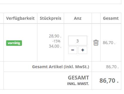 Interactive112 Posted September 21, 2016 Share Posted September 21, 2016 Hallo, In de winkelwagen in de kolom stuks heb ik bij sommige producten een korting verwerkt wanneer men meer stuks bestellen. Wat ik niet echt mooi vind, en onlogisch, dat eerst de kortingsprijs wordt weergegeven, dan de korting en als laatste de orginele prijs, zie ook mijn screenshot. Ik zou dus willen eerst de orginele prijs. =34 dan de korting van 15% zodat als laatste wordt vermeld de uiteindelijke prijs. Ik heb al rond gekeken in shopping-cart-product-line.tpl maar kan niet precies vinden of daar de volgorde kan veranderen. Olly Link to comment Share on other sites More sharing options...