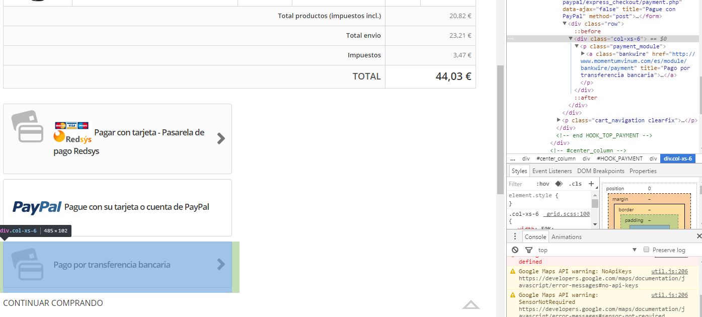 Leosss Posted October 5, 2016 Author Share Posted October 5, 2016 Hola, tan solo has de cambiar la clase en el payment.tpl de cada módulo a col-xs-12. Saludos Hola Enrique, Te comento. Archivos payment.tpl tengo dos, uno en la carpeta '/modules/bankwire/views/templates/hooks/' que está en la raiz, con el siguiente código: <p class="payment_module"> <a href="{$link->getModuleLink('bankwire', 'payment')|escape:'html'}" title="{l s='Pay by bank wire' mod='bankwire'}"> <img src="{$this_path_bw}bankwire.jpg" alt="{l s='Pay by bank wire' mod='bankwire'}" width="86" height="49"/> {l s='Pay by bank wire' mod='bankwire'} <span>{l s='(order processing will be longer)' mod='bankwire'}</span> </a> </p> Luego tengo otro en 'themes/wineshop/modules/bankwire/views/templates/hooks/' con el siguiente código: <div class="row"> <div class="col-xs-12"> <p class="payment_module"> <a class="bankwire" href="{$link->getModuleLink('bankwire', 'payment')|escape:'html':'UTF-8'}" title="{l s='Pay by bank wire' mod='bankwire'}"> {l s='Pay by bank wire' mod='bankwire'} <span>{l s='(order processing will be longer)' mod='bankwire'}</span> </a> </p> </div> </div> Entiendo que lo único que debo hacer es agregar a <div class="col-xs-12"> algo como para que quede así: <div class="col-xs-12 col-md-6">, cierto? Aún así, no funciona. Alguna idea? Link to comment Share on other sites More sharing options...