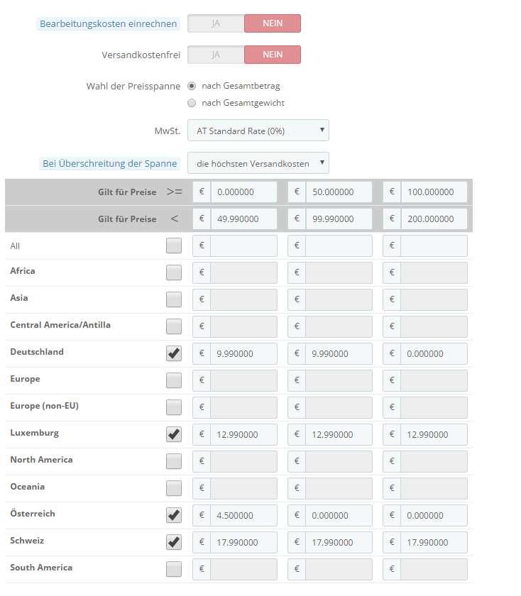 Cats Taste Posted September 29, 2016 Share Posted September 29, 2016 Servus Leute, ich nutze die Shopversion 1.6.1.7 und habe ein Problem, zu dem ich auch nach stundenlanger Recherche keine Lösung finde (weder über Google, noch im Forum). Daher hoffe ich, dass Ihr mir helfen könnt. Ich möchte DHL als Versanddienstleister nutzen und versende in folgende Länder: Innerhalb Österreichs, nach Deutschland, Luxemburg und in die Schweiz. Die Kunden bekommen verschiedene Versandpauschalen: Innerhalb Österreichs von 0.00-49.99€ : 4.50€ Innerhalb Österreichs ab 50.00€: 0.00€ Nach Deutschland von 0.00-99.99€: 9.99€ Nach Deutschland ab 100.00: 0.00€ Nach Luxemburg: immer 12.99€ In die Schweiz: immer 17.99€ Ich habe also die genannten Länder aus der EU-Zone heraus genommen und als eigene Zonen angelegt. Diese Zonen habe ich dann im Versanddienstleister DHL mit Preisspannen versehen. Soweit so gut. Wenn ich im Shop jetzt Warenkörbe unter 50€ generiere, zeigt mir der Shop für jedes Land die richtige Versandpauschale an. Sobald ich aber einen Warenkorb über 50€ anlege, behauptet der Shop, der Versand wäre kostenfrei, egal welches Land ich wähle. Kostenfrei wäre es ab 50€ aber nur nach Österreich. Ich habe schon alle Tricks probiert, z.B. ab der 2. Spanne die Versandkosten um einen Euro erhöht, weil ich dachte, das System kapiert nicht, wenn für zwei Spannen der gleiche Preis hinterlegt ist, aber nichts hilft. Wie gesagt, die Zonen sind aktiv und wenn ich einen Warenwert von unter 50€ habe, zeigt der Shop für jedes Land die korrekten Pauschalen. Aber, ab der zweiten Spanne ignoriert er die Konfiguration komplett und reagiert einfach so, als hätte ich für alle Länder angegeben, dass das Porto kostenfrei ist. Ich habe aber nur einen Dienstleister konfiguriert, es gibt hier also keine Überschneidungen, die das Problem verursachen könnten. Ich habe mal einen Screenshot von meinen Einstellungen gemacht, vielleicht seht Ihr den Fehler, für den ich zu blind bin :-( Ich wäre für jeden Tipp sehr dankbar :-) Liebe Grüße Charlie Link to comment Share on other sites More sharing options...