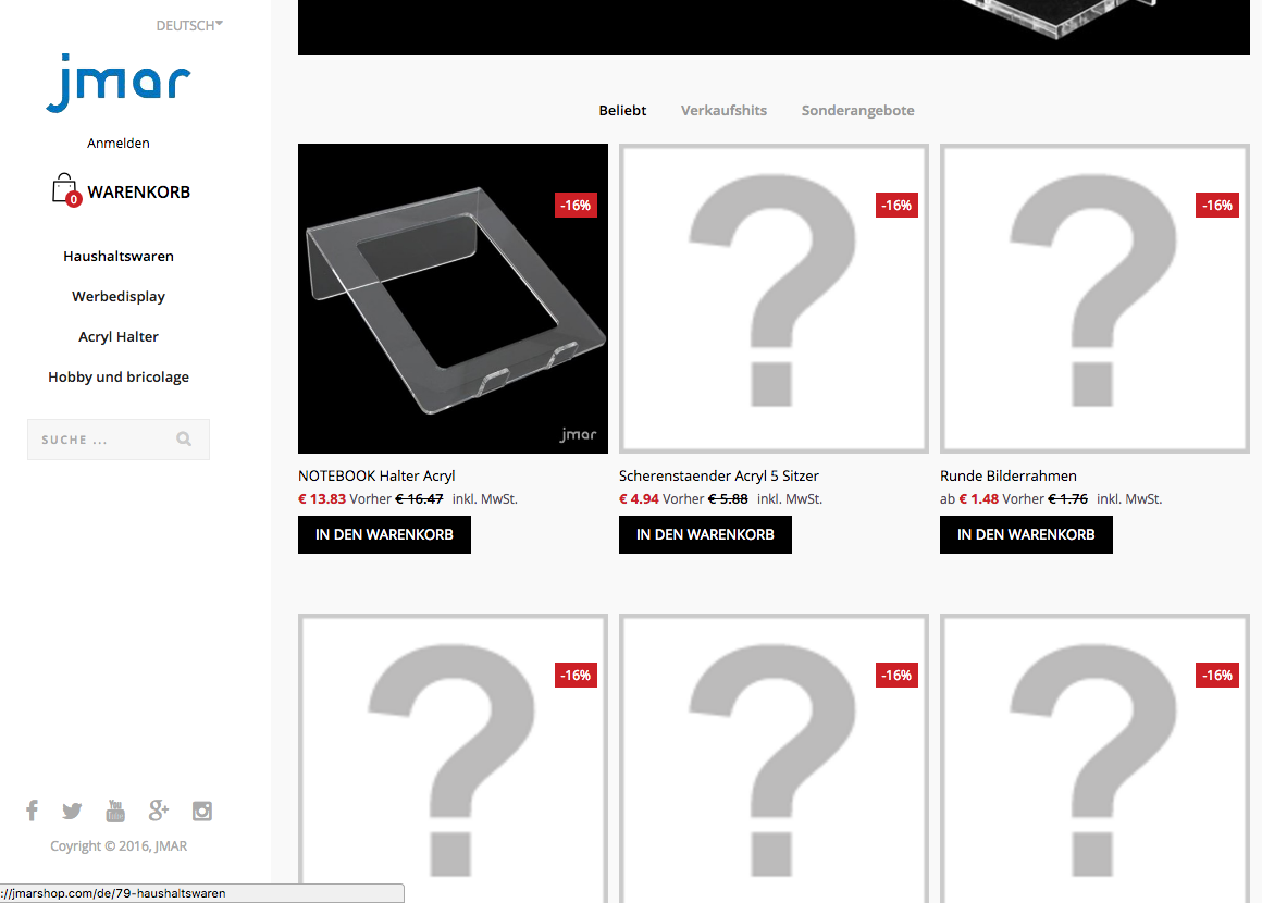 Dave1987 Posted October 4, 2016 Share Posted October 4, 2016 Ciao a tutti, da poco ho cambiato tema al mio negozio (1.6.1.5), installazione tutto ok, moduli a posto, rigenerato miniature ed immagini solo che ho notato che nelle altre lingue (5 in tutti) i prodotti hanno un errore in visualizzazione in quanto si visualizza come se non avessi caricato le immagini (riquadro con punto di domanda). Ho provato a ripassare manualmente e ricaricare le immagini che non vedevo ma niente, dal back office non risulta nessun problema, ma nel front si. Qualche idea / aiuto? Grazie Link to comment Share on other sites More sharing options...