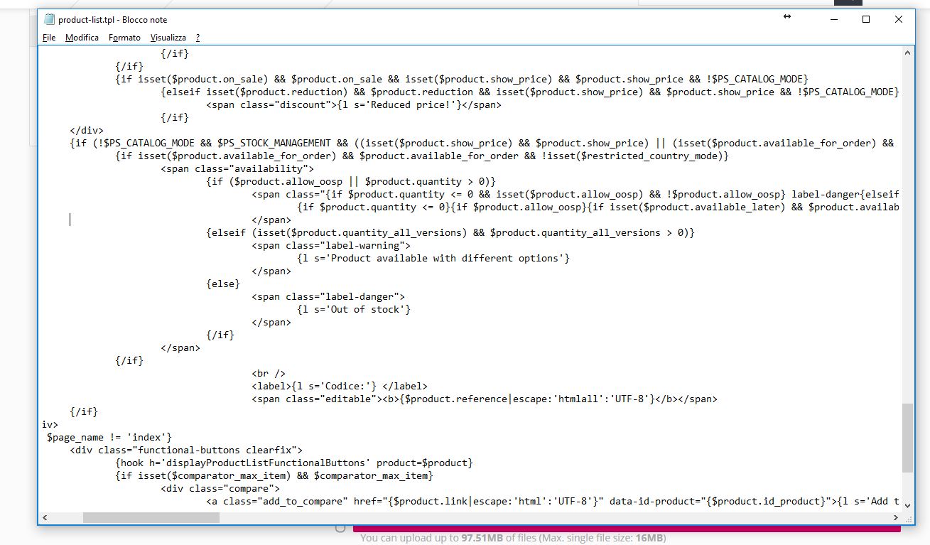 karma91 Posted October 5, 2016 Share Posted October 5, 2016 Buongiorno a tutti! Ho aggiunto tempo fa qualche riga di codice al file product-list.tpl per fare in modo che venga sempre mostrato nell'anteprima dei prodotti il suo riferimento. Funzionava, finché non ho deciso di mettere nelle home tab il blocco dei più venduti. Mentre gli altri blocchi (popolare, offerte, etc.) mostrano la scritta "Codice OE/OEM:" seguita dal riferimento prodotto, sul blocco dei più venduti c'è semplicemente uno spazio bianco. Come faccio a far comparire il riferimento anche in quel blocco? La stringa che ho inserito in product-list.tpl è la seguente. <label>{l s='Codice:'} </label> <span class="editable"><b>{$product.reference|escape:'htmlall':'UTF-8'}</b></span> Vi allego uno screen del codice per farvi capire dove l'ho posizionato. Grazie in anticipo. Link to comment Share on other sites More sharing options...