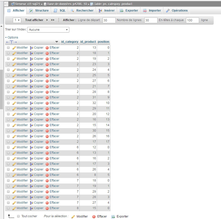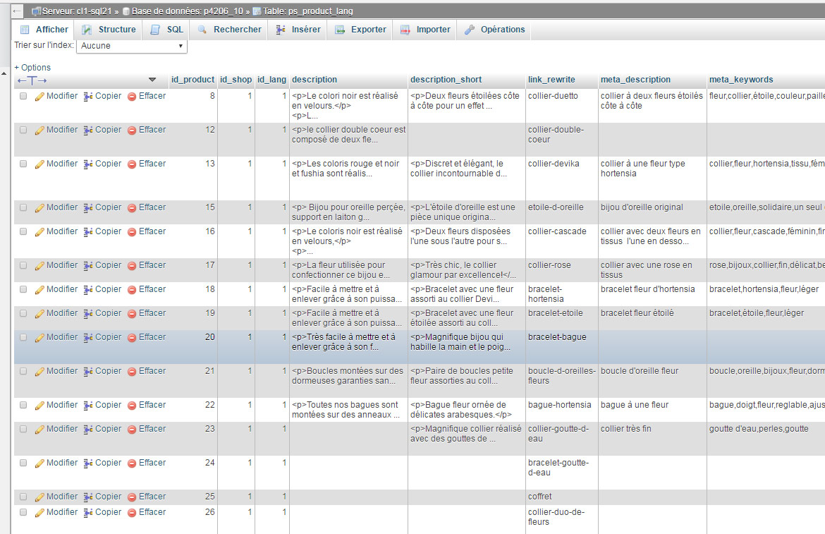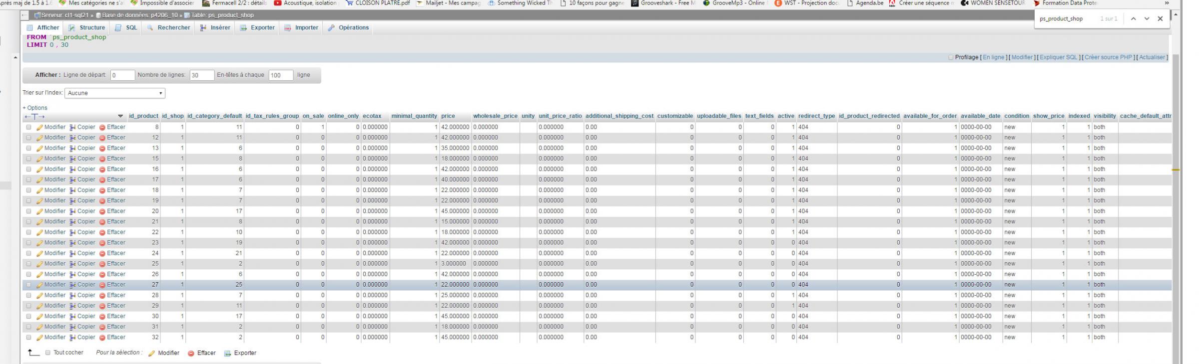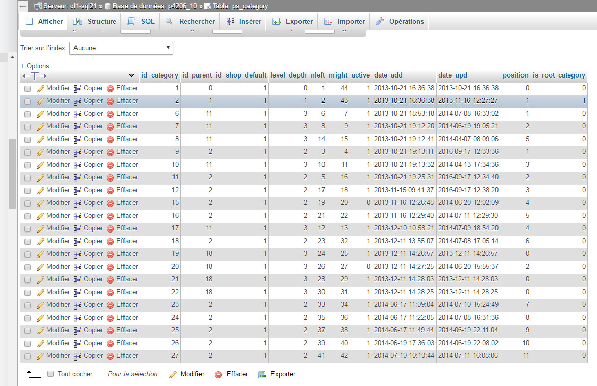 fly_in_the_sky Posted October 7, 2016 Author Share Posted October 7, 2016 J'ai mis en print-screen : les tables suivantes : (que j'ai pas tu tout modifié ... ) ps_category ps_product_lang, ps_category_product ps_product_shop Link to comment Share on other sites More sharing options...