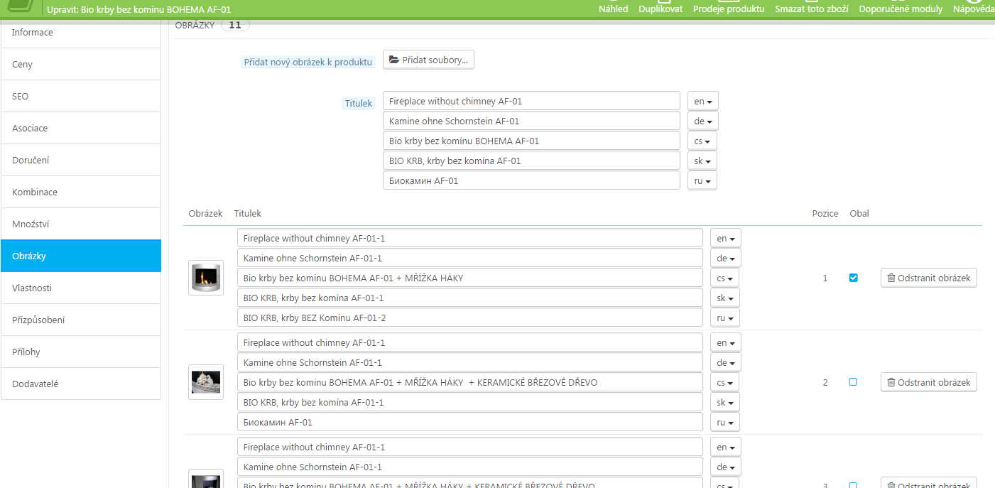 www.bio-krby-kamna.cz Posted October 6, 2016 Share Posted October 6, 2016 (edited) Hello before version 1.6.1.0 of prestashop you cannot edit image caption. With later version can edit, but its very complicated. This solution work with all version 1.6.x Solution from http://pelechano.es/modificar-titulos-en-imagenes-prestashop-1-6/ adminbackoffice\themes\default\template\controllers\products\images.tpl find <td>legend</td> and change to <td style="width: 100%;"> <div class="col-lg-12"> {foreach from=$languages item=language} {if $languages|count > 1} <div class="translatable-field row lang-{$language.id_lang}"> <div class="col-lg-10"> {/if} <input type="text" id="prod_img[idprodimg][{$language.id_lang}]" {if isset($input_class)}class="{$input_class}"{/if} name="prod_img[idprodimg][{$language.id_lang}]" value="listImg_value_{$language.id_lang}" disabled="disabled" {*egp mod creamos este campo plantilla deshabilitado para que luego no se envie. Al copiar ya se habilitara*} /> {if $languages|count > 1} </div> <div class="col-lg-2"> <button type="button" class="btn btn-default dropdown-toggle" data-toggle="dropdown" tabindex="-1"> {$language.iso_code} <span class="caret"></span> </button> <ul class="dropdown-menu"> {foreach from=$languages item=language} <li> <a href="javascript:hideOtherLanguage({$language.id_lang});">{$language.name}</a> </li> {/foreach} </ul> </div> </div> {/if} {/foreach} </div> </td> find function imageLine(id, path, position, cover, shops, legend) { line = $("#lineType").html(); line = line.replace(/image_id/g, id); line = line.replace(/(\/)?[a-z]{0,2}-default/g, function($0, $1){ return $1 ? $1 + path : $0; }); line = line.replace(/image_path/g, path); line = line.replace(/image_position/g, position); line = line.replace(/legend/g, legend); line = line.replace(/icon-check-empty/g, cover); line = line.replace(/<tbody>/gi, ""); line = line.replace(/<\/tbody>/gi, ""); if (shops != false) { $.each(shops, function(key, value){ if (value == 1) line = line.replace('id="' + key + '' + id + '"','id="' + key + '' + id + '" checked=checked'); }); replace to function imageLine(id, path, position, cover, shops, legendJsonArray,cargaInicial) { line = $("#lineType").html(); line = line.replace(/image_id/g, id); line = line.replace(/(\/)?[a-z]{0,2}-default/g, function($0, $1){ return $1 ? $1 + path : $0; }); line = line.replace(/image_path/g, path); line = line.replace(/\.jpg"\s/g, '.jpg?time=' + new Date().getTime() + '" '); line = line.replace(/image_position/g, position); //line = line.replace(/legend/g, legend); egp mod legendas editables..Ahora nos llega un array en json if (typeof cargaInicial != 'undefined'){ //se construye la tabla dinámicamente al cargar la página. Ahora nos llega el array entero legendJsonArray = $.parseJSON(legendJsonArray); }else{//venimos de subir una imagen (ajax.tpl del uploader) legend=legendJsonArray; legendJsonArray={}; legendInput=$('input[name^=legend]'); $.each(legendInput, function(i, input) { lang_id_arr=input['name'].split('_'); legendJsonArray[lang_id_arr[1]]=input['value'];//cogemos los valores del input titulo }); } $.each(legendJsonArray, function(i, item) { search='listImg_value_'+i; replace=item; line = line.replace(search, replace); line = line.replace(/idprodimg/g, id); line = line.replace('disabled="disabled"', ''); //lo habilitamos. }); line = line.replace(/icon-check-empty/g, cover); line = line.replace(/<tbody>/gi, ""); line = line.replace(/<\/tbody>/gi, ""); if (shops != false) { $.each(shops, function(key, value){ if (value == 1) line = line.replace('id="' + key + '' + id + '"','id="' + key + '' + id + '" checked=checked'); }); } $("#imageList").append(line); } find imageLine({$image->id}, "{$image->getExistingImgPath()}", {$image->position}, "{if $image->cover}icon-check-sign{else}icon-check-empty{/if}", assoc, "{$image->legend[$default_language]|@addcslashes:'\"'}"); and change to imageLine({$image->id}, "{$image->getExistingImgPath()}", {$image->position}, "{if $image->cover}icon-check-sign{else}icon-check-empty{/if}", assoc, "{$image->legend|@json_encode|@addcslashes:'\"'}", true); create file override\controllers\admin\AdminProductsController.php with <?php class AdminProductsController extends AdminProductsControllerCore { /*egp mod sobrescrito para poder modificar los títulos de las imágenes*/ public function processUpdate() { $product=parent::processUpdate(); if (empty($this->errors)){ if($prod_img_arr=$_POST['prod_img']){ foreach ($prod_img_arr as $id_image=>$prod_img){ foreach ($prod_img as $id_lang=>$value_legend){ Db::getInstance()->execute(' UPDATE `'._DB_PREFIX_.'image_lang` SET `legend` ="'.$value_legend.'" WHERE `id_image` = '.(int)$id_image.' AND `id_lang`='.(int)$id_lang); } } } } return $product; } } enable overrides Perfomance/Enable ovverides delete cache\class_index.php Edited October 6, 2016 by www.bio-krby-kamna.cz (see edit history) Link to comment Share on other sites More sharing options...