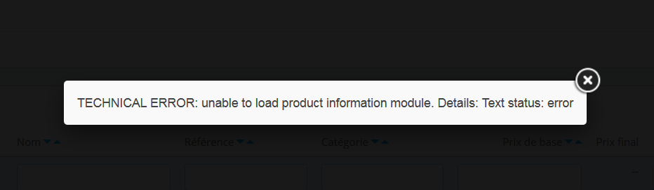 pitchart Posted October 11, 2016 Share Posted October 11, 2016 (edited) Bonjour, Sous prestashop 1.6.1.7 en serveur dédié, sans avoir fait de changement entre hier soir et aujourd'hui, depuis aujourd'hui donc je rencontre un problème de lenteur au niveau du back office et un pop avec ce message d'erreur ; TECHNICAL ERROR: unable to load product information module. Details: Text status: error qui apparait à chaque fois que je vais sur un menu, module, catalogue, produit etc... Avez-vous une piste sur ce problème ? (si besoin de + d'info n'hésitez pas) Merci Edited October 12, 2016 by pitchart (see edit history) Link to comment Share on other sites More sharing options...