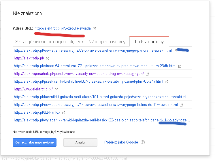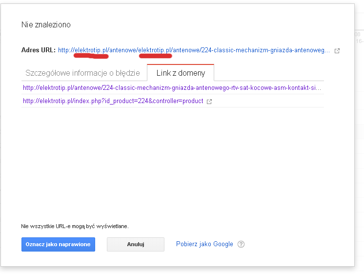 W zakładce błędy indeksowania pojawia mi się lista ponad 3000 stron nieznalezionych. Gdy wchodzę w poszczególne adresy URL podane na liście, pojawiają się m.in. takie komunikaty (zdublowany adres domeny): -> screen1 w załączniku