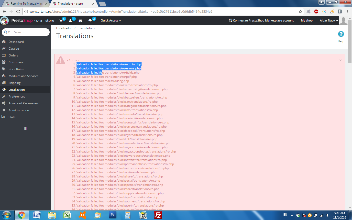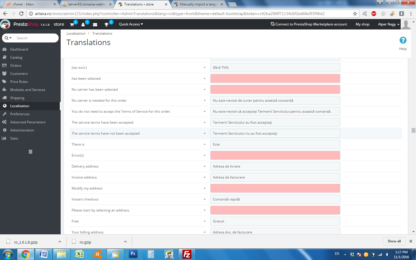 nagyalp Posted November 1, 2016 Share Posted November 1, 2016 Hello, I am using version 1.6.1.8 I modified the romanian language translation. After that I exported manually and I got a new ro.gzip. Than I try to import manually it after a new instalation of Prestashop but i have 77 errors: Documentation sais that the new ro.gzip should overwrite the old one... Please help! Link to comment Share on other sites More sharing options...