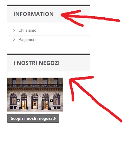 Fabry Posted October 14, 2016 Share Posted October 14, 2016 Vorrei fare due cose, vorrei riuscire a tradurre la parola 'Information' ma nei files di traduzione non l'ho trovata. Inoltre vorrei togliere il Box 'i nostri negozi'. Vedere immagine allegata. Come posso fare? Grazie per le numerose risposte... 1) Admin>Localizzazione>Traduzioni ...Poi: Tipo di traduzione: moduli installati Tema: scegliere il tema in uso..deduco che sia il default Selezionare la lingua sotto appariranno tutti i moduli.....scegliere Blocco CMS, lá dentro troverá la rispettiva voce da tradurre 2) Admin>Moduli> ..dalla lista Disinstallare Blocco Negozi. That' all Fabry 1 Link to comment Share on other sites More sharing options...