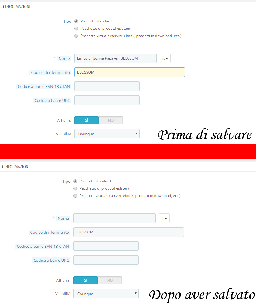 davidanna23 Posted October 16, 2016 Share Posted October 16, 2016 (edited) Buongiorno, da ieri sera, quando provo ad aggiungere un nuovo prodotto, dopo aver inserito, titolo e descrizione, salvo e rimango, ma i campi sono ancora vuoti. Fino a ieri mattina però andava tutto alla perfezione. Ho anche aggiornato PS all'ultima versione, ma nulla da fare, non è cambiato nulla. Ho provato a cambiare Browser, ancora nulla. Vi è mai capitato? Come posso risolvere? (Per farvi capire meglio, vi metto in allegato una foto di prima e dopo aver salvato il nuovo prodotto da aggiungere) Edited October 16, 2016 by davidanna23 (see edit history) Link to comment Share on other sites More sharing options...