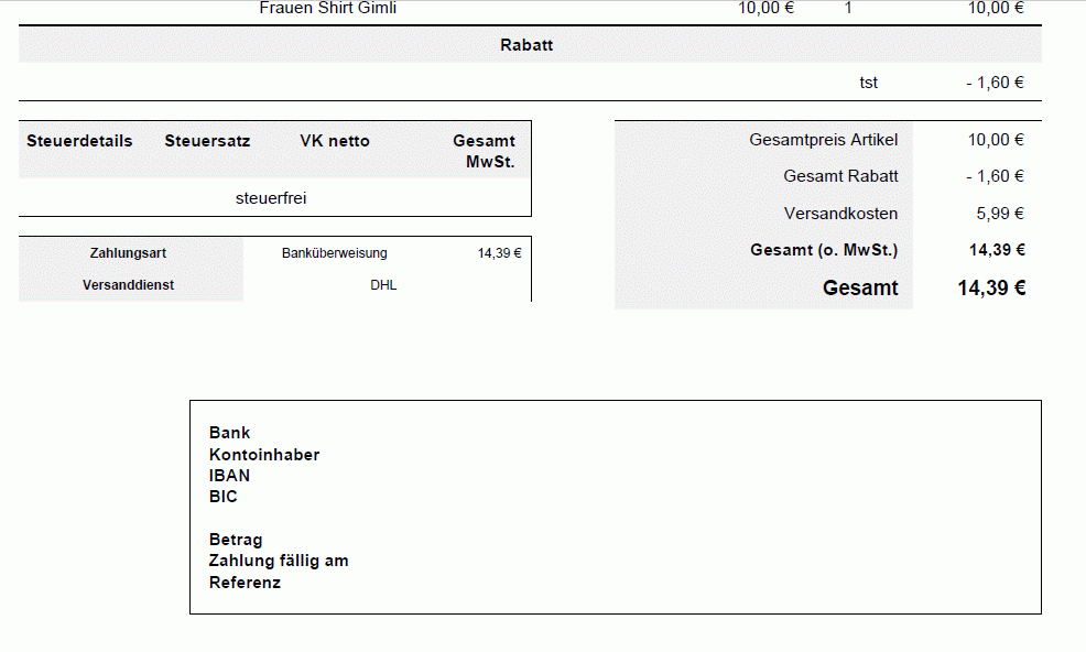 rictools Posted October 22, 2016 Share Posted October 22, 2016 Ein Screen im Anhang Völlig normal, hier können die Bankdaten für die Rechnung nicht herkommen. eleazar, bist du sicher, daß sich an der Rechnung in Version 1.6.1.6 nichts geändert hat? Ich habe noch 1.6.1.4 und verwende eine auf deiner Rechnungsvorlage basierende Rechnung ... Es handelt sich ja offenbar um den Hook $HOOK_DISPLAY_PDF. meier85, benötigst du die Anzeige der Kontodaten oder können diese auch ganz weg? Dann müßte das Löschen oder Auskommentieren des folgenden Textes am Ende der invoice.tpl (im pdf-Ordner deines Templates) helfen: {if isset($HOOK_DISPLAY_PDF)} <div style="line-height: 1pt"> </div> <table style="width: 100%"> <tr> <td style="width: 17%"></td> <td style="width: 83%">{$HOOK_DISPLAY_PDF}</td> </tr> </table> {/if} Link to comment Share on other sites More sharing options...
