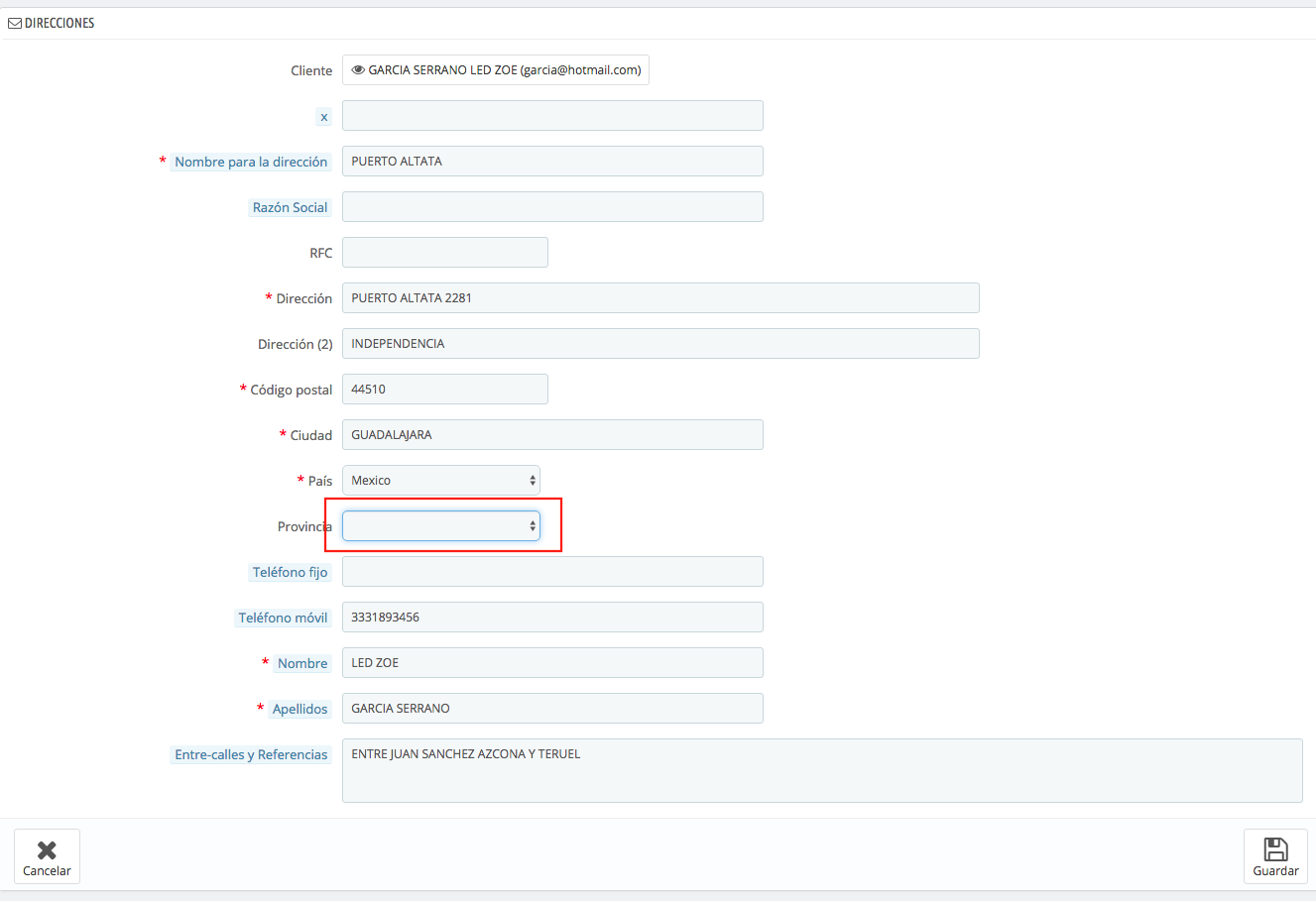 zedmx Posted October 19, 2016 Share Posted October 19, 2016 Buen dia, pues he buscado tanto en español o ingles y no encuentro solucion. Resulta que el campo correspondiente a Provincia no funciona desde el back office, se queda en blanco sin poder seleccionar nada, siendo que las provincias estan bien habilitadas, sin embargo desde el front office todo funciona correctamente. Debido a que tomamos pedidos via back office es muy importante la funcion de este campo, que hasta hace un par de dias funcionaba sin problema. Adjunto imagen Ojala alguien me pudiera decir que fichero tocar para corregir este asunto. Gracias de antemano. Link to comment Share on other sites More sharing options...