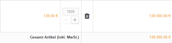 Premooks Posted October 20, 2016 Author Share Posted October 20, 2016 (edited) Dann stimmt es zwar von der Anzeige so, aber im Warenkorb sieht man, dass er die 139 immernoch auf den Stückpreis bezieht. Ja, ich könnte ausrechnen wie viel 1 Stück kostet bei 500 & 1 bei 1000 aber das soll ja nicht der Sinn der Sache sein weil er das dann so anzeigt. Der Kunde soll sozusagen nichts per Hand etwas eingeben können Edited October 20, 2016 by Premooks (see edit history) Link to comment Share on other sites More sharing options...