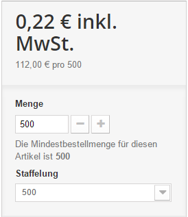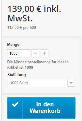 rictools Posted October 20, 2016 Share Posted October 20, 2016 Der Kunde soll sozusagen nichts per Hand etwas eingeben können Also so ganz verstehe ich jetzt nicht wie es am Ende aussehen soll ... Ich würde halt für 500, 1000 etc. jeweils ein Attribut erstellen, das dann aber "1"-mal bestellt wird (und nicht 500, 1000 etc.-mal), angezeigt wird dann der Preis für das 500-, 1000- usw. Stück-Paket, den Einzelpreis kannst du zusätzlich als Grundpreis angeben (x € pro Stück). Link to comment Share on other sites More sharing options...