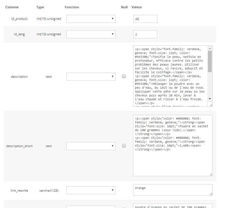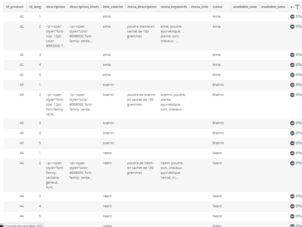 chti56 Posted October 21, 2016 Author Share Posted October 21, 2016 Voici dans la capture jointe un extrait de la table ps-product-lang (on y trouve pourtant des descriptions...)... JP Link to comment Share on other sites More sharing options...