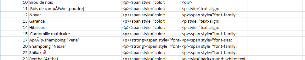 chti56 Posted October 21, 2016 Author Share Posted October 21, 2016 J'ai essayé cette modification sur le fichier que tu m'as transmis: SELECT p.`id_product` AS `ID`, pl.`active` AS `Actif`, pl.`name` AS `Nom`, pl.`price` AS `Price`, pl.`reference`AS `reference`, pl.`ecotax` AS `Ecotax`, pl.`weight` AS `Weight`, pl.`quantity` AS `Quantity`, pl.`description_short` AS `Desc_short`, pl.`description` AS `Desc_long` pl.`meta_keywords` AS `Meta-keywords` FROM `ps_product` p LEFT JOIN `ps_product_lang` pl ON (p.`id_product` = pl.`id_product`) WHERE pl.`id_lang` = 2 Mais j'ai une erreur sur le ligne meta-keywords... Je pense que c'est dû au fait que cette colonne ne se trouve pas dans la table ps_product.. Comment le spécifier ?? Merci Link to comment Share on other sites More sharing options...