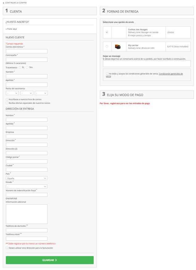 gerardcelma Posted October 25, 2016 Share Posted October 25, 2016 Hola Foreros! Os comento mi problema. Estoy creando mi web con prestashop, y no quiero que los usuarios puedan registrarse y tener una cuenta. He eliminado esta opción de la homepage, pero en el proceso de checkout me aparece como primer paso. Os paso un screenshot para que veáis a que me refiero. Lo que me gustaría es eliminar la parte de "¿Ya esta inscrito?", y unificar los datos de cliente y dirección de entrega en un mismo formulario. Para que el conjunto sea coherente, tan solo deberia haber un boton al final del proceso, del tipo "realizar pedido". Alguien ha tenido el mismo problema y ha encontrado la solución? Un saludo y muchas gràcias! Link to comment Share on other sites More sharing options...