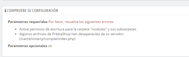 bronte100 Posted October 25, 2016 Share Posted October 25, 2016 (edited) buenas tardes, quería comentar un problema que voy encontrando esta ultima semana... comento el tema: resulta un día estoy con mi tienda (por cierto es multitienda) y subo una imagen a un modulo y se me crusea el prestashop le pido a mi servidor restaure copia de seguridad y todo bien.... ahora empiezo a notas los módulos dejan de funcionar...usease en el back me deja en algunos hacer cambios en otros no pero en la web no hay manera que haga cambios todo igual... o como mucho me deja hacer alguna cosilla y en seguida otra vez que no me deja en rendimiento de golpe me salieron dos errores: COMPRUEBE SU CONFIGURACIÓN Parámetros requeridos Por favor, resuelva los siguientes errores Active permisos de escritura para la carpeta "modules" y sus subcarpetas Algunos archivos de PrestaShop han desaparecido de su servidor.(/cache/smarty/compile/index.php) Parámetros opcionales ok a ver si me podéis ayudar por que la pagina es para un cliente y me estoy desesperando porque nunca me había pasado.... Edited October 25, 2016 by bronte100 (see edit history) Link to comment Share on other sites More sharing options...