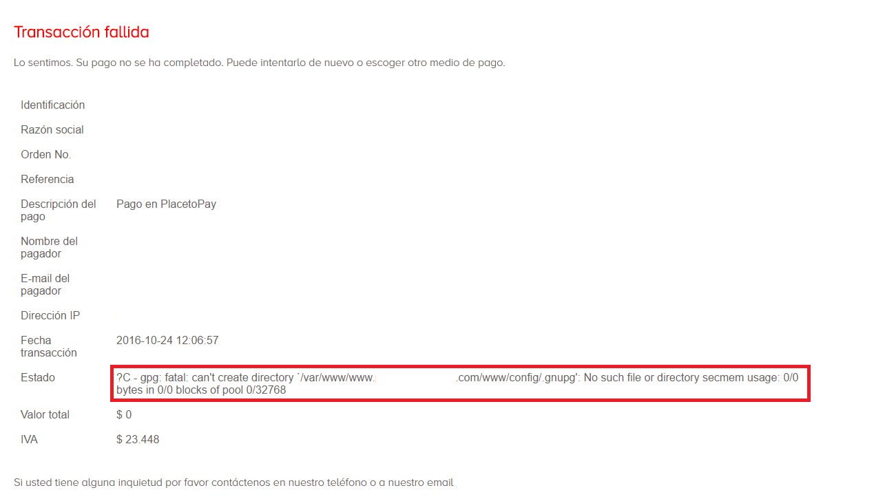simpl202 Posted October 25, 2016 Share Posted October 25, 2016 Buen dia compañeros, quisiera pedirles ayuda acerca de un problema que tengo con mi tienda virtual. Cuando le doy pagar, me sale transaccion fallida y muestra en el estado algo que no entiendo como solucionar. Espero me puedan recomendar que puedo hacer ya que ando perdiendo ventas por este motivo. Muchas gracias. Link to comment Share on other sites More sharing options...