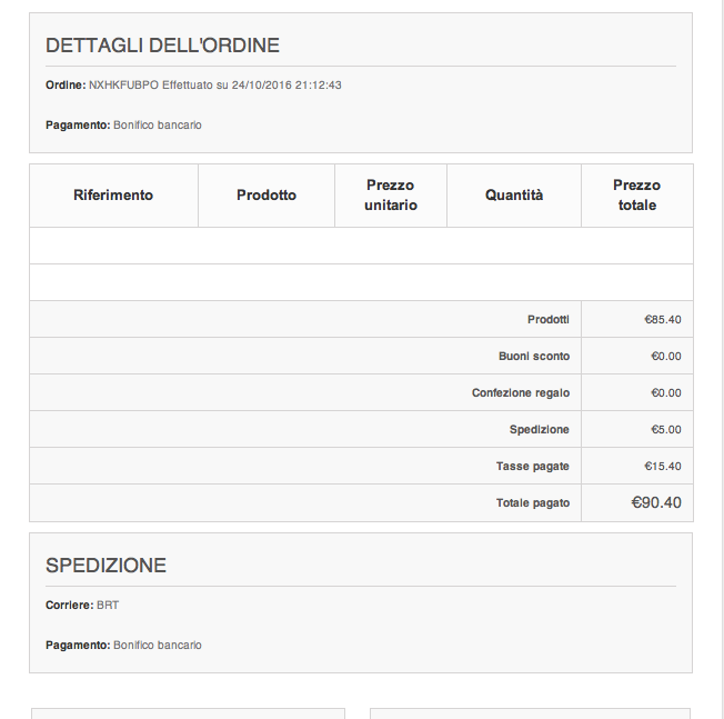 nimodeo Posted October 25, 2016 Share Posted October 25, 2016 Buonasera, ho configurato il mio ecommerce con pagamento "bonifico bancario" (non so se può essere un'informazione utile) e mi sono reso conto che, facendo la procedura d'acquisto, al cliente arriva la conferma di ordine automatica, ma senza alcun dettaglio. In pratica il campo "Riferimento" ""Prodotto" "Prezzo" "Quantità" ecc sono vuoti (vedere allegato). So che il dettaglio può essere visto cliccando sul link della cronologia ordini in basso, ma non è la prima cosa che viene in mente di fare e credo che sia molto importante per un cliente poter vedere queste informazioni da subito prima di procedere al pagamento. C'è un modo per mostrare queste informazioni? Grazie mille per l'aiuto! Link to comment Share on other sites More sharing options...
