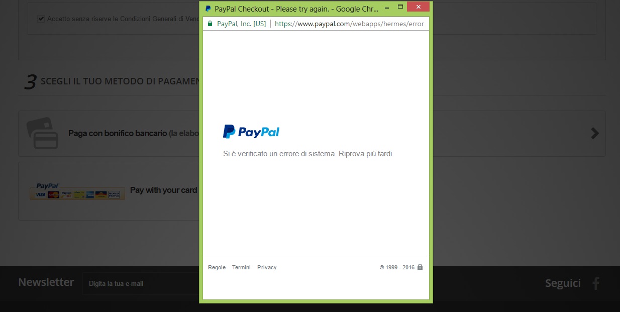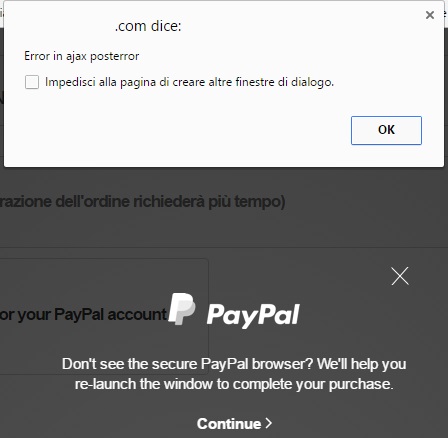 gym Posted October 25, 2016 Share Posted October 25, 2016 Ciao a tutti, ho installato la versione 1.6.1.7 di Prestashop caricato dall'hosting 1&1, dopo avere inserito categorie, prodotti, ecc. vado per configurare i metodi di pagamento e dopo averli impostati secondo dei tutorial visti e rivisti su questo forum e anche su altri vado a selezionare un prodotto mettendolo sul carrello, quando vado a procedere per l'acquisto trovo la schermata dove ci sono i 2 metodi di pagamento: Paypal: Clicco e compare una finestra dove dopo aver caricato (con un lucchetto al centro) mi da l'errore: Si è verificato un errore di sistema. Riprova più tardi. Se chiudo la finestra un'altra comunicazione. Bonifico: Clicco e mi da la finestra della sintesi dell'ordine ed è tutto ok. Appena clicco su Confermo il mio ordine compare una finestra di errore dove dice che la pagina non funziona (HTTP ERROR 500), dopo nel pannello di controllo del negozio risulta che l'ordine è stato effettuato ed è in fase di accettazione. Dop ho contattato 1&1 e sul loro sito mi hanno fatto cambiare il link in SSL Starter e poi su Prestashop in URL e SEO ho modificato il link SSL. Dopo ho reinstallato il modulo Paypal inserendo tutti i parametri chiesti. Adesso quando vado a concludere l'acquisto, cliccando su paypal compare un errore: error in ajax posterror allego qualche foto e aspetto vostri suggerimenti. Ringrazio anticipatamente tutti quelli che risponderanno per dare aiuto. Grazie. Link to comment Share on other sites More sharing options...