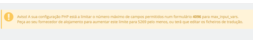 selectshop.at Posted October 28, 2016 Share Posted October 28, 2016 Eu quando fiz a tradução deu um erro mas depois pedi para alterar esse valor e refiz a tradução mas não resolveu. Mas pode efetivamente haver mais algum parâmetro a bloquear... Captura de ecrã 2016-10-25, às 13.27.26.png O seu servidor ainda esta limitando. O valor do max_input_vars ainda está em menos 4096 bytes, dos requisitados 10000. O seu provedor nao alterou o valor para o necessitado de 10000 veja lá no tópico dos valores mínimos requisitados: max_input_vars = 10000 Nao acertando os valores mínimos necessários, sempre vai dar problema no uso do Prestashop (tmb. fazendo um upgrade, que nao resolverá o problema mesmo). Problemas = servidores mal configurados. Link to comment Share on other sites More sharing options...