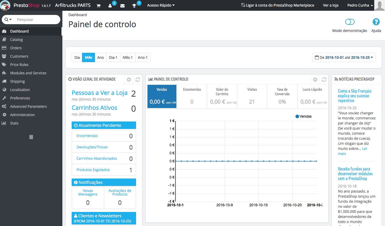 selectshop.at Posted October 26, 2016 Share Posted October 26, 2016 O meu também está assim. A versão que uso é 1.6.1.7 O dashboard está em ingles, achei eles para atualizar na mão como você disse acima, mesmo assim ele continua em ingles. Deletou o smarty cache e cache do seu browser ? Vc. instalou que idioma quando o Prestashop foi instalado ? Instalou em Português ou em Inglês ? Instalou POrtuguês depois como idioma extra ? Comparou os requisitos mínimos com os do seu servidor ? Está usando memcache ? Ou cache de disco ? Se sim, entao desabilite ambos, atualize o idioma PT novamente, deleta o smarty cache e o cache do seu browser e verifique. Link to comment Share on other sites More sharing options...